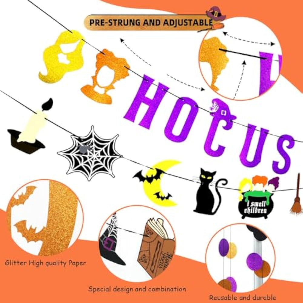 | ??Unique Hocus Pocus Decorations : Our Hocus Pocus Decor Consists Of Three Pieces. They Are Features The Hocus Pocus Banner, And A Combination Of Unique Halloween Patterns Garland And Dot Garland. It Is Perfect For Decorating Your Halloween Hocus Pocus Party And Easily Catches The Attention Of Others. This Hocus Pocus Decorations Create A Strong Halloween Ambiance, Adding Color And Uniqueness To The Festivities. It Ensures A Festive And Enjoyable Halloween Experience. | | ??Eye-Catching Hocus Pocus Decor: The Halloween Hocus Pocus Banner Is Made Of Sturdy And Durable Cardboard With Glitter, Creating A Sparkling Effect That Makes It Stand Out At Halloween Parties And Sets A Captivating Atmosphere. Allowing For Repeated Use. We Provide A Long Rope That Allows You To Hang The Banner Anywhere Easily. It Can Be Easily Dismantled And Stored, Catering To All Your Needs. | | ??Easy To Use Decorate: Our Hocus Pocus Halloween Decoration Banner Comes Pre-Strung, Eliminating The Need For Manual Assembly. This Saves