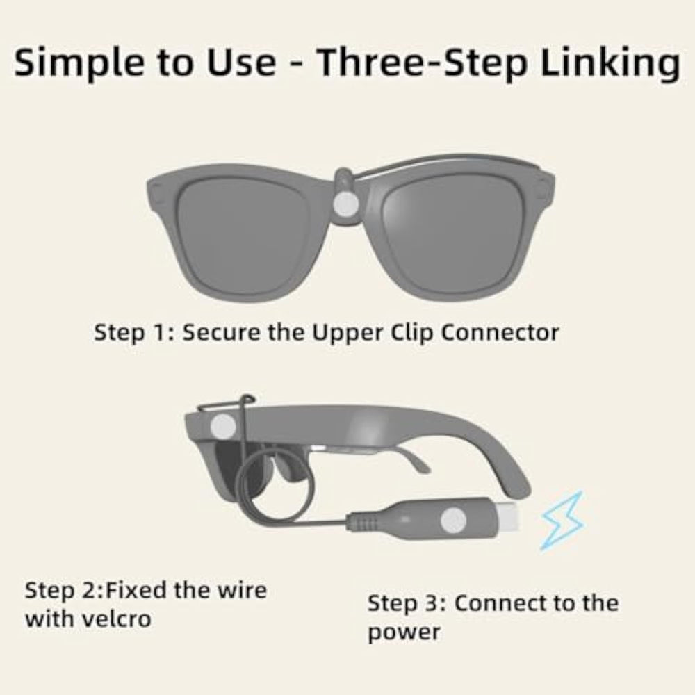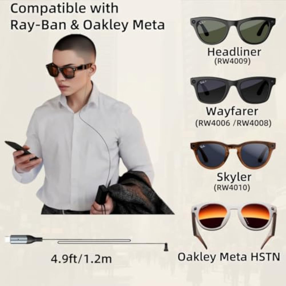 | Perfectly Compatible With Ray-Ban Meta (Wayfarer, Headliner, Skyler) And Oakley Meta ,: Designed For Wayfarer, Headliner, Skyler And Oakley Meta Models, The Glasses Can Be Charged Directly Without A Charging Case, And They Can Be Used While Charging - During Meetings, Commuting, Traveling, Wearing Uninterrupted Power Around The Clock, Completely Saying Goodbye To Battery Life Anxiety. | | Triple Hard-Core Upgrade: It Adopts Strong And Durable Tep Cable (Anti-Pull And Anti-Entanglement), Built-In Safety Protection Chip (Anti-Overcharging And Anti-Short Circuit), And Interface Reinforcement Design (Anti-Bending And Anti-Breakage), Which Is Specially Designed For Outdoor Commuting, Travel Storage, Daily Frequent Plugging And Unplugging, Etc., Greatly Improving The Durability And Safety Of The Ray-Ban Smart Glasses Charging Cable. | | Convenient Clip-On Design, Charging Without Feeling Experience: It Is Firmly Fixed On The Left Temple (With Rubber Ring To Enhance Stability), And The Cord Length Can Be Freely Adjusted To Make It Completely Hidden From Sight; Whether You'Re Commuting, Working, Exercising Or Traveling, You Can Achieve Stable Charging Without Interfering With Any Activity You Can Do With Your Glasses. | | Full-Scenario Power Supply Compatibility Military-Grade Safety Protection: Say Goodbye To Power Anxiety! Mobile Phones, Computers, Chargers, Power Banks Plug And Charge; Built-In Precision Voltage Regulation Chip And Ptc Intelligent Protection, Providing Over-Voltage, Over-Current, Over-Temperature, And Short-Circuit Quadruple Protection, Ensuring That Ray-Ban Glasses Can Be Charged Quickly, Stably, And Safely Under Any Power Source. | | Pocket Charging Station: Extremely Compact And Lightweight Design, Easy To Store In Commuter Bags, Pockets And Even Wallet Compartments; Whether It'S A Business Trip, Daily Commute, Café Nap Or Meeting Break, You Can Quickly Access It Anytime, Anywhere, Quickly Recharge Your Ray-Ban Smart Glasses, And Say Goodbye To Bulky Chargers Completely. | | Perfect Gift: This Rayban Meta Charging Cable Is Practical And Elegant, So That Your Glasses Will Never Have To Worry About Battery Life, And It Is The Best Gift For Friends And Loved Ones On Birthdays, Christmas, Easter, Halloween, Etc. | |