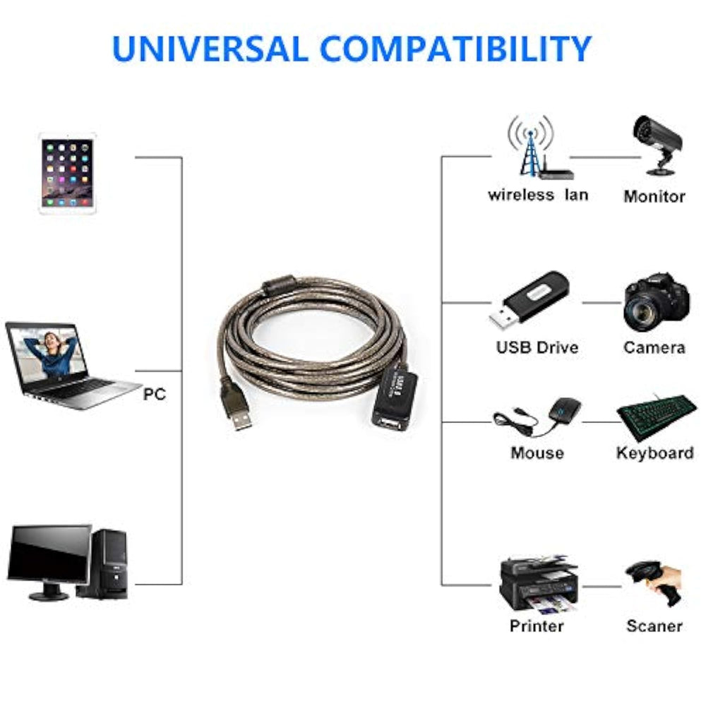 | ?Usb 2.0 Extension Cable?: Using It To Extend The Cable Connection Between Your Computer/Laptop And Most Of Usb-Enabled Device, Including Iphone, Keyboard, Camera, Printer, Mouse, External Hard Drive, Usb Flash Drive, Card Reader, Voip Phone And More. Note: This Usb Extension Cable Cannot Be Used For Charging Devices. | | ?Premium Quality?: The Active Usb 2.0 Extension Cable With Built-In Signal Booster Chipset And Premium Shielding Provide Stable Transmission With The Clear Optimal Signal.Help Ensure Efficient Data Transfer And Reduce Potential Interference. | | ?Fast Data Transfer?: This Usb 2.0 Male To Female Extension Cable Designed With High Quality Tinned Copper, Provides Superior Cable Performance And Error-Free Data Transmission. Full Usb 2.0 Capacity Ensure High Speed Data Transfer Up To 480 Mbps. | | ?Extend Protect Usb Port? With This Long Usb Extension Cord, Effectively Increase The Length Of Your Original Usb Cable, No Need To Squeeze Yourself To The Back Of The Tv Or Desktop To Connect Usb Disk Or Other Usb Peripherals Anymore; Protecting The Usb Sockets On Your Devices From Repeatedly Pluging And Unpluging. | | ?Compatible?: This Usb Extender Cable Does Not Have An Adapter And Can Only Be Used In Usb Devices With Low Currents Such As Fax Machines , Printers , Scanners , U Disk , Card Reader ,Mouse And Keyboard ,Touch Screen,Etc. | |