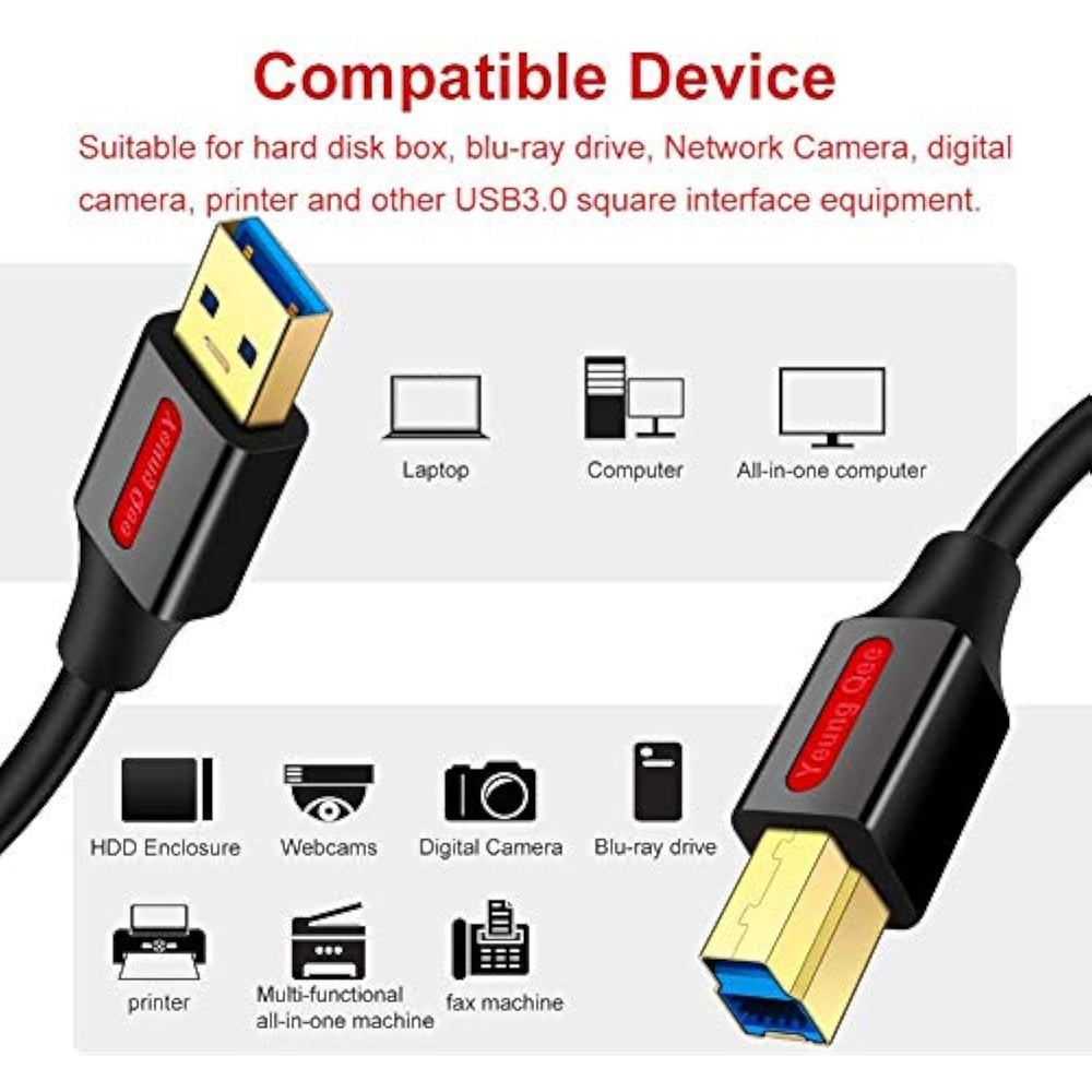 | High Speed Transmission?Usb A To Usb B Cable Data Transfer Speed Up To 5 Gb/S, 10X Faster Than The Speed Of Usb 2.0, Perfect Fit Into The Usb 3.0 Port In Your Devices.If You Want The Fastest Transfer Speeds Between Your Computer/ Laptop And External Device Please Use This Cable. | | Usb A To Usb B 3.0 Cable? Connect Usb 3.0 Type-B Devices (Hard Drives And Printers) To Your Usb Type-A Devices (Pc And Mac). For Data Transfer.Can Bear 15000+ Bending Test. Built To The Highest Standards | Strong, Durable And Robust | Ensures Maximum Performance. | | Wide Compatibility?Usb 3.0 Type A To Type B Cable Compatible With Printer, Usb 3.0 Monitor, Usb 3.0 Hub,External Hard Drive,Fujitsu Scansnap Ix500 Scanner, Dell S2340T Monitor, Dell Usb 3.0 Docking Station, Hp Usb 3.0 Port Replicator And More Devices With Usb 3.0 Type-B Port. | | Premium Quality:Usb 3.0A-B Cables Are Corrosion-Resistant Gold-Plated And Aluminum Foil Shieldin ,Making Usb 3.0 A Male To Usb B Male Cable With Stable Signal And No Noise. And The Usb 3.0 Male To Usb B Male Cable Cord More Long-Term Performance. | | What You Get?We Provide This Usb 3.0 Cable A Male To B Male With 18-Month Worry-Free And 24/7