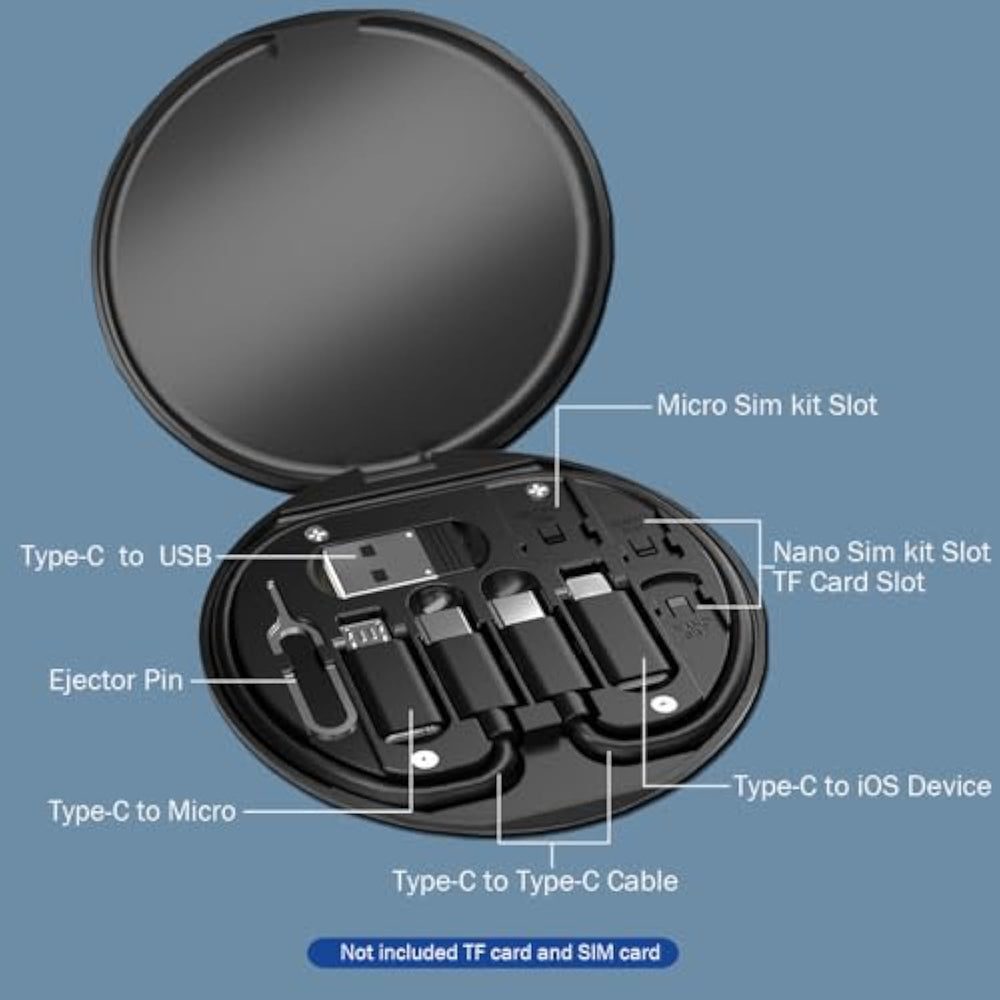 | ?Safe Charging And Data Transfer?: The Mini Digital Gadget Has Four Different Ports For Conversion, Charging, Transmission And More. Contains Usb C Cable With 3 Usb Adapters Got All You Need To Charge And Transfer Data For Android/Ios Devices. | | ?All-In-One Charging Solution?:No Fumbling For The Right Connector Through A Tangled Mess. This Portable Storage Box Has All You Need To Charge And Sync Your Device. The Storage Case Protects The Ends Of The Cables, And Prevents Them From Getting Tangled In Your Bag | | ?Durable Material?:All The Adapters Made Of A Scratch Resistant Aluminum Alloy. The Internal Copper Wire Is Larger And Thicker Than Normal Cables, Which Helps Increase Charging Speed And Transfer Data For Cell Phones, Tablets, Laptops And Other Devices. | | ?Compact Portable?This Digital Travel Cable Kit In 3.2*0.4 Inches, It Is Easy To Be Taken In Pocket, Wallet And Handbag | | ?Multi-Functional Storage Case?: This 9 In 1 Cable Case With 3 Storage Slots, 2 For Nano Sim Cards, 1 For Micro Sim Card Storage (Sim Card Is Not Included) And A Sim Eject Tool, Help You Swap And Store Your Sim Cards Easily. The Carry Case Is Also A Phone Holder | |