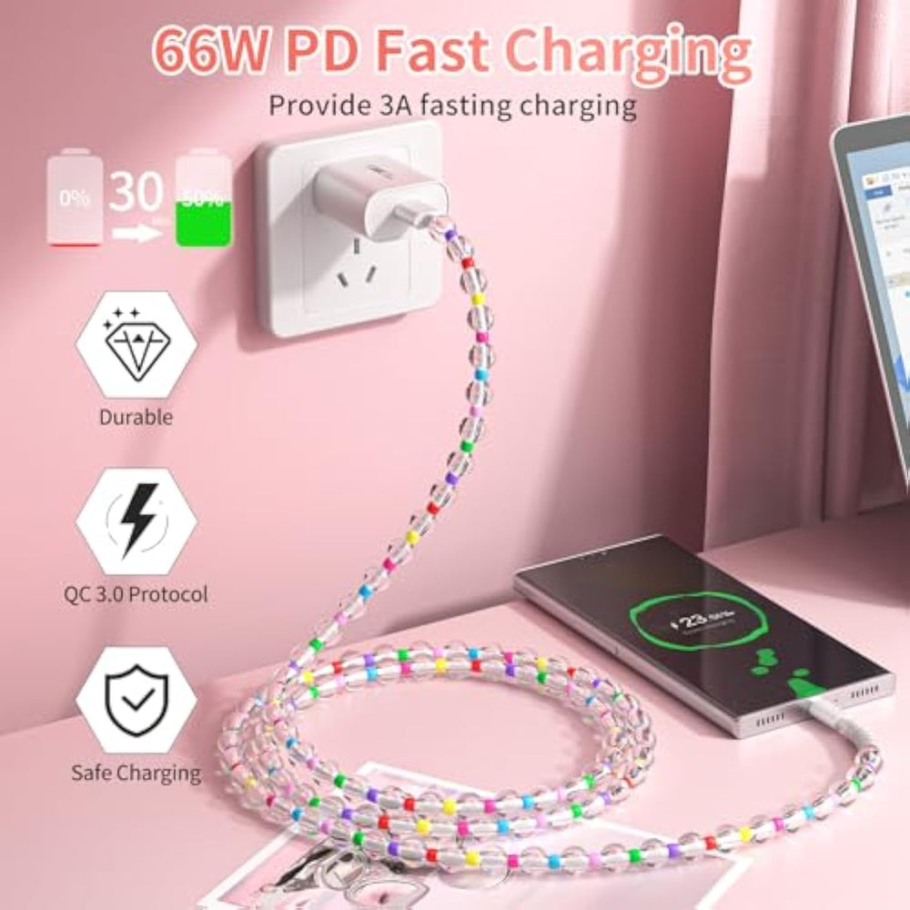 | Compatibility: This For Iphone Charging Cable Is Compatible With Iphone 17 16 Pro Max/ 15 Pro Max Plus, Galaxy S24/S23/S22/21/20, S10+/S10/S10E/S9+/S9/S8+/S8, Note 10 5G/10/9/8, A40/A41/A50/A51/A52 And All Usb-C Devices, Including Phones, Tablets And Laptops | | 66W Fast Charging And Data Sync: Our Usb A To Usb C Cable Supports 60W Safe High-Speed Charging Output, The Usb C Charging Cable Can Fully Charge Most Mobile Phones From 0% To 50% In 30 Min, It Also Supports Data Syncing Speeds Of Up To 480Mb/S | | Durable Heavy-Duty: Usb C Cord Is Constructed With High-Quality Copper And Coated With Premium Tpe, Tested To Withstand Over 50,000 Bend Lifespan. Features An Aluminum Foil Signal Shielding Layer And Overvoltage Protection For Faster And Safer Charging | | 6.6Ft Cute Charger Cable: Our Transparent Beaded Charger Cord Has A Stylish And Cute Appearance, And Long Phone Charging Cable Is 6.6Ft/2M Long Allowing You To Place Your Devices Exactly Where You Need Them For Comfortable Use While Charging | | Worry Free Shopping: The Team Provides You With Good Usb A To Type C Cable, Please Rest Assured That Our Products Have Been Strictly Inspected; If You Encounter Any Problems During The Purchase Of Your Product, Please