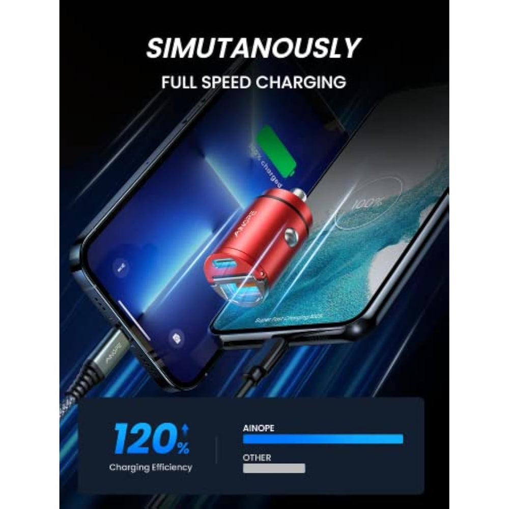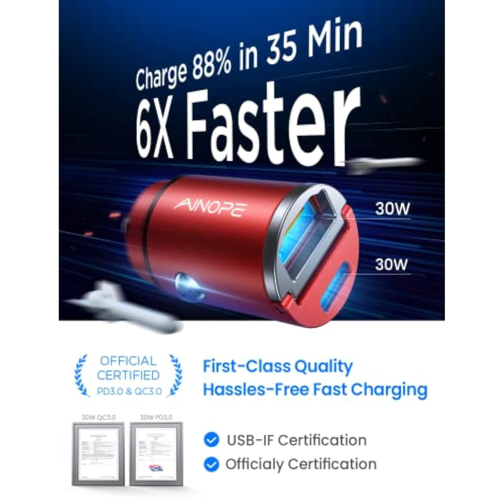 | ?36W Pd 36W Qc Super-Fast Charging??This Mini Usb C Car Charger Fast Charging Is Equipped With Pd 3.0 (36W) Qc 3.0 (36W) Dual-Port To Maximize Your Device Charging Speed, Which Can Rapidly Charge Iphone 15 From 0% To 80% Within 30Mins And Fully Charged Samsung Galaxy S22 In 1 Hour. | | ?Fully Compatible With All Fast Charge Protocol?: This Usb Car Charger Has Been Recognized By Official Usb-If And Qualcomm And Passes 15 Multi-Layer Tests, Compatible With [Pd 36W/Pps 25W/Qc 36W]. The Charging Efficiency Has Increased By 88% , Charging Stability Rate And Charging Safety Increased By 93% , So You Can Charge Faster And Safer. | | ?Upgrade Nice Pull Ring For Extracting?: You'Ll Love The Car Charger Pull Ring That Lifts Up To Easily Remove From Dash, While Other Compact Car Chargers Is Very Hard To Unplug And Easy To Damage The Usb Cigarette Lighter Adapter. | | ?Upgrade Smallest Body, Flush Mount?: The Smallest Car Charger Iphone On The Market Until Now. With A Tiny Thumb-Sized (Size: 1.72Inch*0.86Inch*0.86Inch) Body, Snug And Flush With Outlet Does Not Protrude And Gets In The Way, Perfectly Hide In Your Usb C Cigarette Lighters. The Usb Car Charger Port Is Also Equipped With A Blue Led Light, So You Can Easily Find The Charging Location While Driving At Night. | | ?Upgrade All Zinc Alloy, Certified Safe For Rapid Charge?: The Compact Usb C Car Charger Upgrade All Zinc Alloy, Will Not Be Overheating At High Temperatures, Which Is Safer Than A Plastic One. 'S Smallest Fast Car Charger Is With Multiple Safety Systems And Full Safety Certifications Not Only Can Provide A Powerful Charging Speed But Also Bring Complete Protection For You And Your Devices. | | ?We Care For You?: This Usb C Car Charger Comes With 365 Days .Welcome To