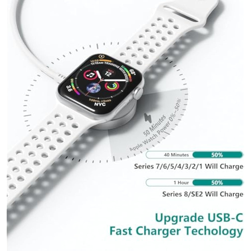 | ?Compatible For Apple Watch Series?:The Iphone Watch Charger Cable Is Compatible For All Iwatch Series Ultra/9/8/7/6/Se/ 5/4/3/2/1 (Including 38 Mm 40 Mm 41 Mm 42 Mm 44 Mm 45 Mm Version) | | ?Usb C Fast Charger? Our Apple Watch Charger Comes With Usb C Fast Charger Adapter. It Can Fast Fully Charge Your Apple Watch 7 Within 2.5 Hours.(Note: For A Better Experience, We Hope You Remove The Iwatch Case And Use The Adapter We Provide.) | | ?Multiple Safety Protection?: Iwatch Charger Cable Is Made Of High Quality Abs+Pc And Pure Copper Wire, Has Been Tested For 10000+ Times. Built-In Safety Functions Such As Over Current, Over Voltage, Short Circuit, And Over Temperature Protection To Provide You With A Safe Charging Environment And A Good Charging Experience. | | ?Ultralight And Perfect 6Ft Length?: With Lightweight And Portable Design, This 3 Feet Watch Charging Cable Is Fit In Your Travel Bag Or Pocket To Take It On The Go Or Simply Use At Home And Office, Charge Your Apple Watch Anywhere Anytime. | | ?What You Will Get?:1 Pack Iwatch Cable (3Ft) And 1 Pack Usb C Iphone Charger.Our Iwatch Charger Comes With A 1-Year Worry-Free Replacement .If You Have Any Questions About This Watch Charger, Please Feel Free To
