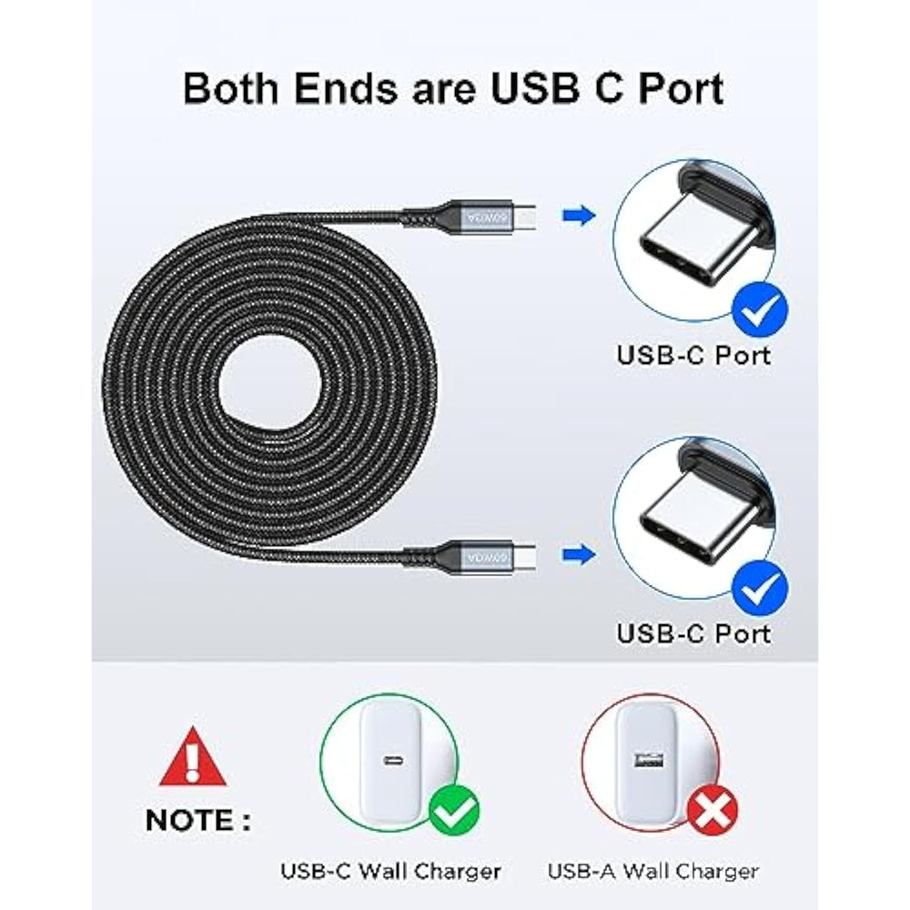 | 60W High Speed Charging And Sync:This Usb C Charger Cable Support Pd3.0/Qc3.0/4.0 Fast Charging Up To 60W Max (20V/3A) With Usb-C Power Delivery Adapters Such As 30W/45W/60W. Which 2.2X Faster Than 3.1A Version And Charges Usb C Phone From 0% To 88% Within 35 Minutes, And Data Transfer Speeds Up To 480Mbps Compatible With Samsung,Ipad Air Mini Pro,Macbook And More Etc | | Usb C To Usb C Cable:This Is A Usb C To Usb C Cable ?????? ?????? ?? ???? ?????? ?? ??????????, Which Means It Has The Same Usb C Plug On Both Ends, So You Need A Usb C Wall Charger To Charge Your Device | | Incredible Durability: Noticeable Difference In Build Quality Strong Fiber, The Most Flexible, Powerful And Durable Material, Makes Tensile Force Increased By 200%. Can Bear 10000+ Bending Test. Premium Aluminum Housing Makes The Cable More Durable,Nylon Braided Type C Cable Is More Heavy-Duty Compared To Pvc Cables Adds Additional Durability And Tangle Free | | Wide Compatibility: This Type C Charging Cable Can Fast Charge And Sync Well Compatible With Ps5 Wireless Controller, Samsung Galaxy S20/S20+ Ultra S10 S10E S9 S8 Note 20 10 9 8, A51/A50/A12/A11, Moto Z/Z2, Lg G5/G6/V20/V30 And Other Usb-C Devices | | What You Get: We Provide This Usb C To Usb C Cable 3.3Ft With An 18-Month Worry-Free Period And 24/7