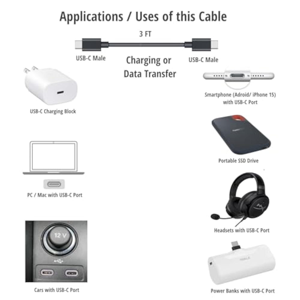 | Important Note: You Need A Usb C Type C Ac Adapter To Be Able To Use This Cable To Charge Your Smartphone, Wireless Headset Or Earphones And Tablets. The Usb C Ac Adapter Is Not Included. | | This Usb C Male To Usb C Male Charge Cable, Cord Or Wire Is Used To Charged Newly Released Wireless Bluetooth Headsets And Earphones. This Is Compatible With New Beats Flex, Sony, Jabra, Jbl, Sennheiser, Beyerdynamic, Jbl, Boltune, Anker More. This Is Compatible With Sony Wh-1000Xm3 Wh-Xb900N Wixb400/B Black Bluetooth Wireless In-Ear Headphones And More. | | This Usb Type C To Type C Can Be Used To Charge Transfer Data To And From Newly Android Smartphones With A Type C Port. This Is Usb-C To Usb-C Wire Is Compatible With Samsung, Google Pixel, Lg, Motorola Moto, Tcl, Oneplus And Other Smartphones Or Tablets With A Usb C Port. | | This Usb C To Usb C Cable Can Be Used To Transfer Data From Your Smartphone, Pc, Tablet Or Similar Electronic Devices To A Portable Ssd Device Or External Hard Drive. This Is Compatible With Sandisk Extreme, Samsung T5 T7, Crucial X6, Seagate Barracuda, Sabrent Rocket Nano Other Portable Ssd Or External Hard Drive With A Usb Type C Port. | | Specifications: Usb C Type Male To Usb C Type C Male ( Usb Type Male To Male) Charge And Data Transfer Cable / Cord/ Wire, 3Ft, Black | |