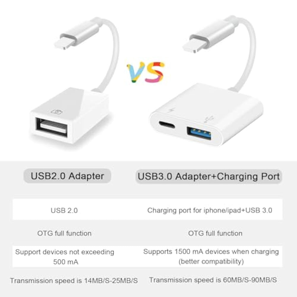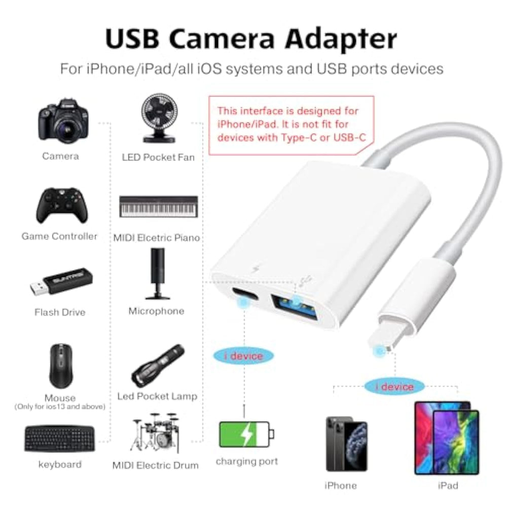 | Plug And Play: The Usb Adapter For Ipad Does Not Require An Application, And There Is No Need To Remove The Camera'S Memory Card.Using A Usb To Iphone Adapter, You Can Copy Beautiful Scenery And Cute People Photos And Videos To Iphone And Ipad.This Is An Excellent Choice For Copying Photos Or Videos From The Camera In A Short Time.(Tips: Not Fit For Iphone 15 Series And Other Usb-C Devices) | | Strong Compatibility: The Iphone To Usb Adapter Supports Standard Photo Formats,Including Jper And Raw,And Sd,Hd Video Formats,Including H.264 And Mpeg-4. Support All Iphone With Ios 9.2 And Up And Ipads With Ios 8.0 Or Later. | | Charge Your Iphone And Ipad: This Usb Adapter For Iphone Adds A Charging Port For Iphone/Ipad, Charging,View Photos Or Videos Can Be Operated At The Same Time.Don'T Worry About The Power Shortage Of Your Phone Anymore.More Importantly, This Usb To Iphone Adapter Can Also Allow You To Share Battery Power With Your Friends And Solve Your Friends' Urgent Needs. | | Friendly Office Helper: Light And Reliable, Short Cable, Better Performance.With Usb Camera Adapter, You Can Directly Plug The Pc Keyboard Or Mouse Into The Ipad?Improving Your Typing Speed And Productivity. | | Do The Best: Using The Usb Camera Adapter,Will Bring You More Interesting Moments,Using The Iphone To Usb Adapter, Will Bring You More Convenience. | |