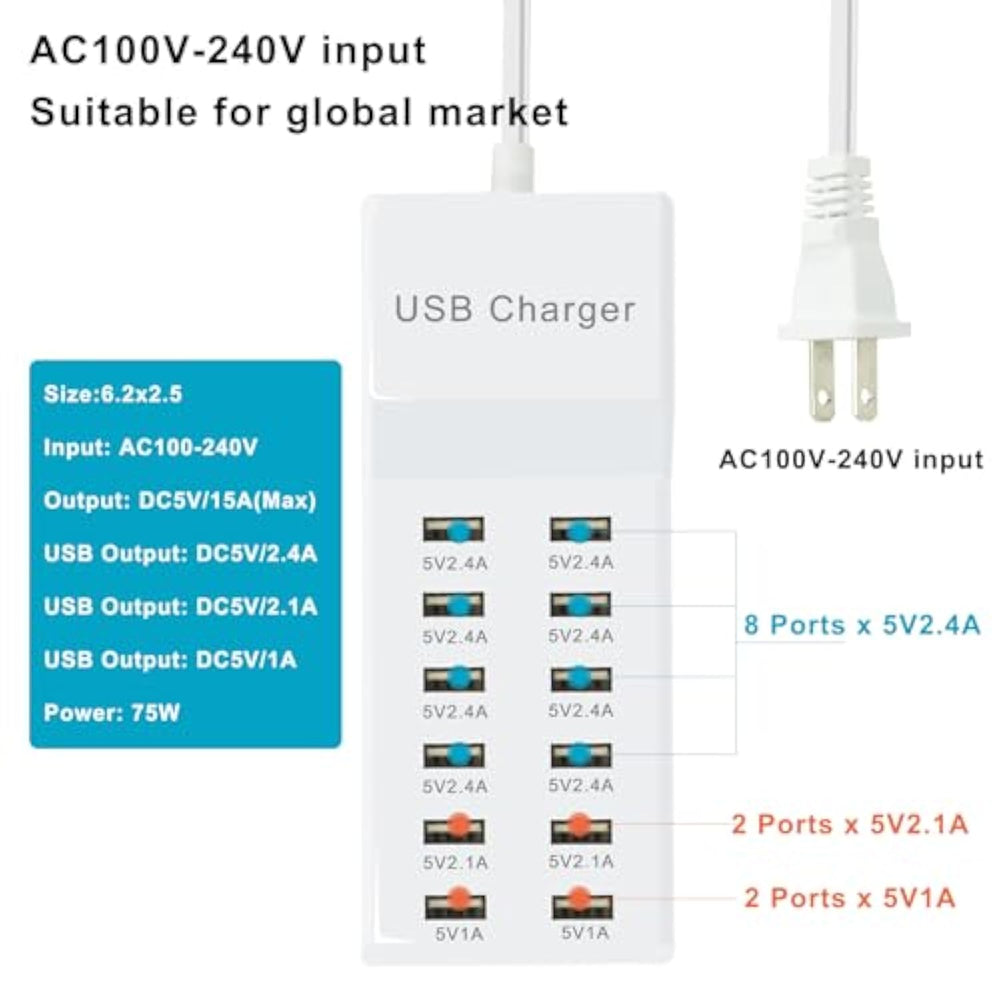 Usb Charger Advanced Technology: Usb Charging Station Provides The Fastest Possible Charging For Multiple Devices, Up To 2.4A Per Port | | Wide Compatibility: You Can Charge Your Smartphone Or Table With This Handy Multi-Port Charging Station. It Will Also Energize Your E-Reader, Bluetooth Headphones, Portable Speakers, And Other Devices That Charge With A Usb Cable. | | Lightweight Design:The Compact Design Of The Usb Hub Charger Provides A Convenient Way To Distribute Power For Workbench And Floor Standing Applications, Perfect For Desktop Applications Such As Home, School, Office, Party Traveling, Etc.Lightweight Design And Easy To Carry. | | Multiple Safety Protection:12-Port Usb Charger, Each Usb Charging Port Has Its Own Current Output, Independent Of Each Other And Not Related To Each Other, Which Improves The Charging Safety Coefficient; And The Use Of Flame-Retardant Pc Shell, With Overheating, Overcharging, Overcurrent, Overload, Short-Circuit Protection, Which Automatical.