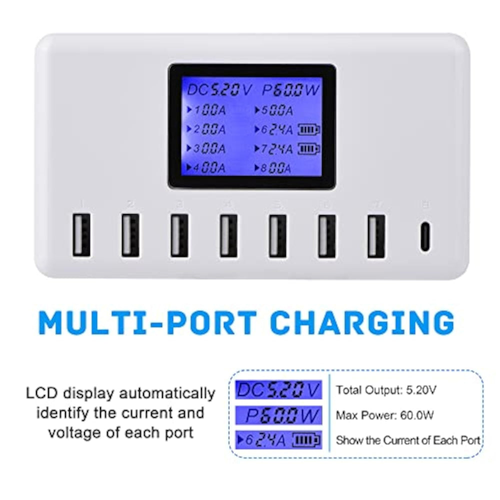 | 8 Ports Usb Charger Station: Armed With Up To 8-Ports, Usb Charging Station Supports Charging All Your Family Devices At Once. Not Only Free Yourself From Looking For Extra Outlets When You Are In A Family Party, But Also Make Your Multi Usb Charger Cables Organized And Get Your Desktop Clean And Tidy. | | Ultra Powerful: Eight Ports Pump Out Total 60 Watts Of Power Equipped With Auto Detect Technology, Maximizing The Highest Charging Speed And Energy Efficiency For Each Port, Provide The Optimal Current And The Quickest Charge. It’S Your Best Travel/Family Companion. | | Lcd Display Type C Port: Intelligently Detect And Deliver The Appropriate Charging Current For Each Device, With High-Resolution Lcd Digital Display Screen, Now You Can Visually Monitor The Current And The Charging Status Through Your Naked Eyes. The Extra Type C Port Allows More Possibilities Of Charging Cables To Be Connected To This Multi Port Usb Charging Station. | | Superior Protection: Overcharge, Overcurrent, Overload, Surge, Short Circuit Protection In The Multiple Usb Charger, Completely Ensures Your Devices' Safety And Offers Them Full-Scale Protection. | | Compact Size Portable Design: Small Pocket Size (Dimensions: 4.9*2.7*1 Inches) Can Easily Put Into Your Pocket/Suitcase Or Backpack And Its Lightweight Makes It The Best To Carry Wherever You Go. Compact And Tight Design Makes It The Best For Home, Office And Destop And Travel Use. | |