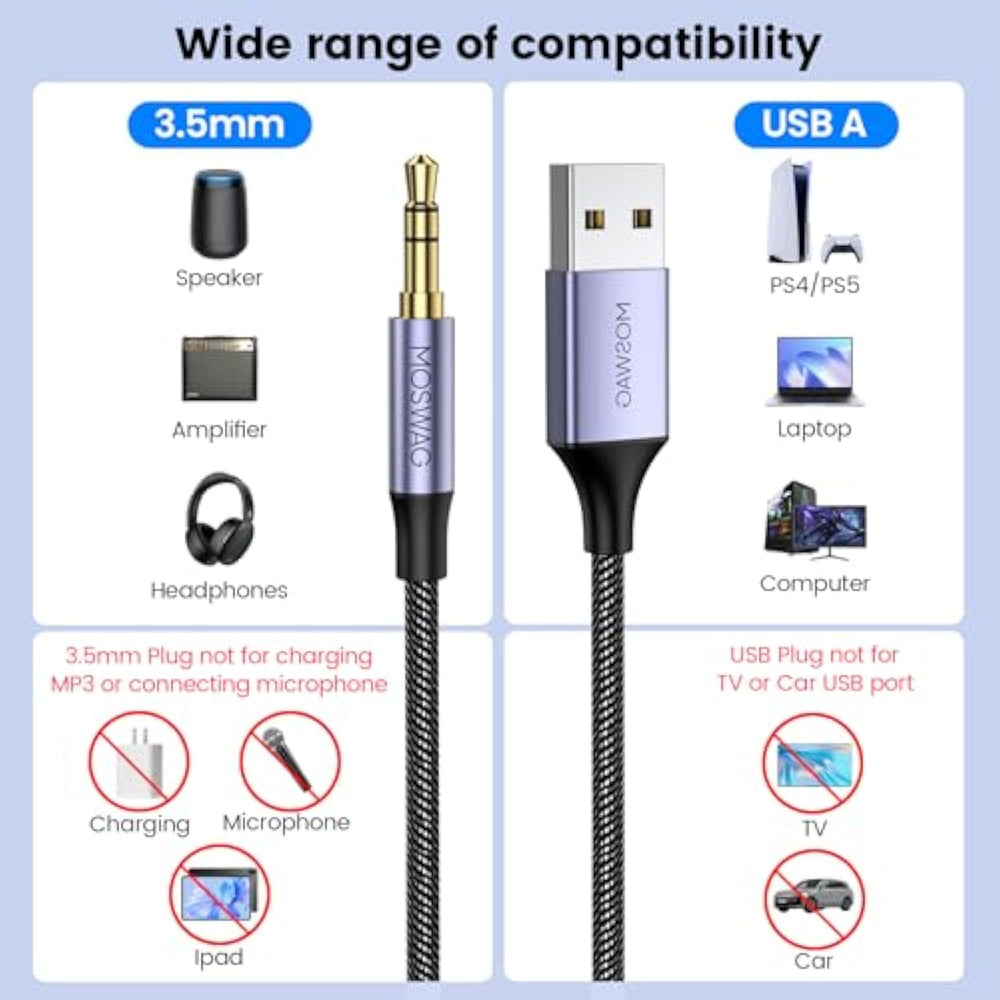 ?Usb Male To 3.5Mm Trs Cable?This Usb Male To 3.5Mm Trs Cable Is Made Of High Quality Nylon Braided Jacket, Flexible And Elastic. The Cable Can Be Bent In Any Direction To Prevent Twisting And Tangling, Making The Device More Flexible And Durable, And Can Support At Least 10,000 Times Of Plugging And Unplugging, So It Can Easily Cope With Daily Heavy Use. | | ?High-Quality Audio?Usb External Sound Card Built-In Proprietary Advanced Dac Chip, Effective Decoding Of Sound Signals And Optimize The Amplification Of Analog Signals, So That The Sound Is More Clear, To Provide You With A Different Listening Experience, Is The Right Choice For Music Lovers! | | ?Plug And Play?This Usb Audio Cable Is Ideal For Replacing A Faulty Sound Card Or Audio Port. It Makes It Easy To Add A 3.5Mm Auxiliary Port (Audio Out Connector) To Your Device. Suitable For Any Device With A Standard 3.5Mm Audio Jack, Plug The Usb Port Into Your Computer And The Computer Will Convert To An Audio Cable. Simple Usb Co.