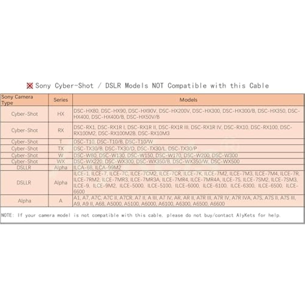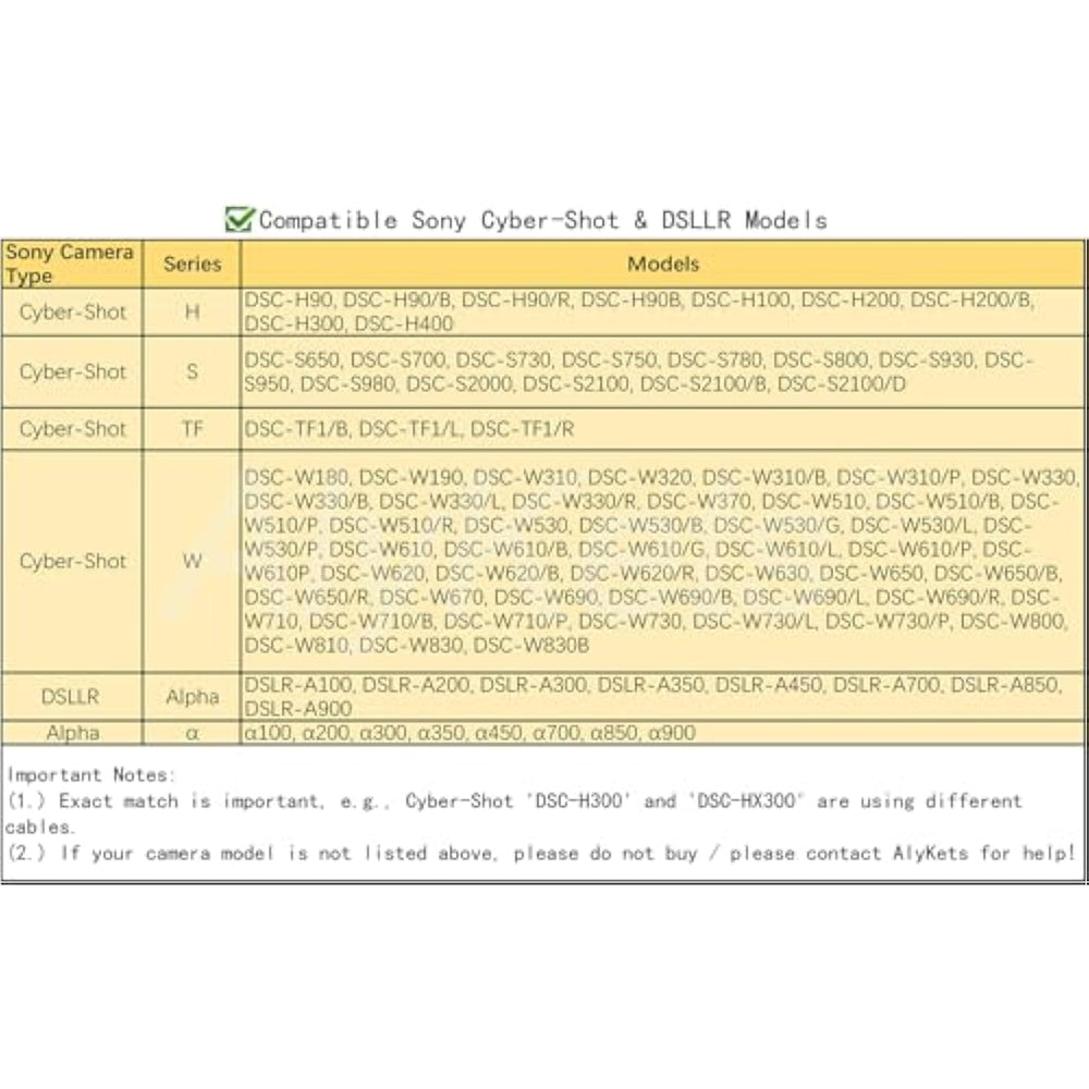 | 100% Brand New And High Quality 5.0 Ft Long Picture Transfer Charger Cable With Usb-C Connector For Easy Transferring Of Files From Your Camera To Your Computer Or Smartphone. Compatible With Pcs, Laptops, Iphone 15, Smartphones, Tablets, Macbook With A Usb-C Port. | | Compatile With: Sony Cybershot Cyber-Shot Dsch200 , Dsch-200, Dsch300 , Dsc-H300, Dscw370, Dsc-W370, Dscw800, Dsc-W800, Dscw830, Dsc-W830, Dscw180, Dsc-W180, Dscw310, Dsc-W310, Dscw320, Dsc-W320, Dscw530, Dsc-W530, Dsc-W630, Dsc-W650, Dsc-W670, Dsc-W690, Dsc-W710, Dsc- S950 S980 S750 S780 S650 S700 S730 S780 S800 S930 S2000 S2100 A100 A200 A300 A350 A450 A700 A850 A900 | | Note?This Not Compatible With All Sony Camera Models. !!! Please Checking Your Camera Model Before Your Purchasing. !!! If You Have Any Problem, Please