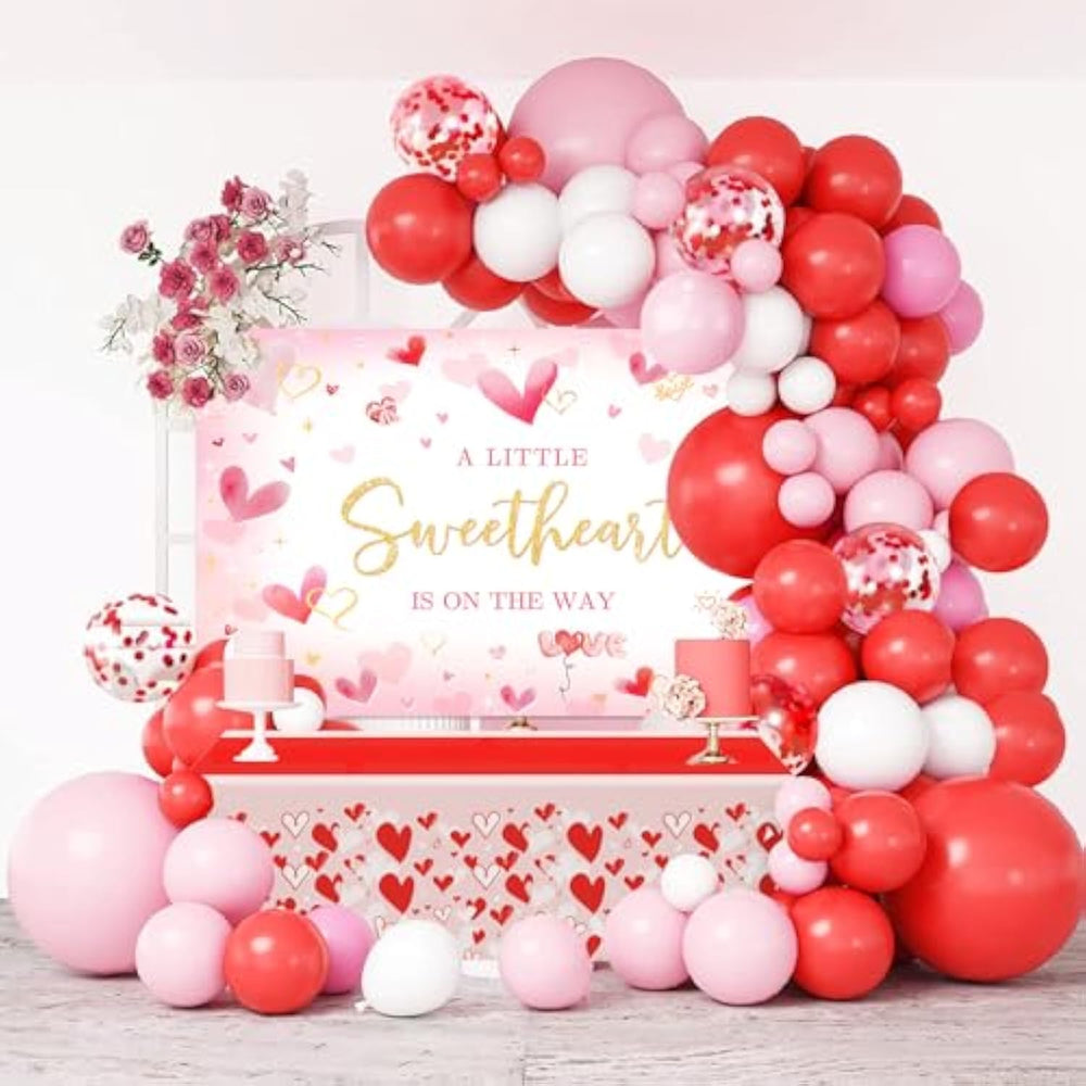 | Pakcage Includes: Sweetheart Baby Girl Shower Decorations Set Including 172 Balloon (Pink, Red ,White, Red And Pink Glitter Balloon ), A Little Sweetheart Is On The Way Banner, And A 54" X 108" Pink Heart Tablecloth. Add An Love Touch To Your Event With A Valentine Theme | | Premium Quality Material: Valentines Baby Shower Decorations Set Is Made From Premium Latex For Durability And Vibrant Colors, Perfect For A Wonderful Sweetheart Themed Baby Shower Party. High-Quality Banner, Printed With Love Hearts Gold Dots Patterns Make The Whole Party More Sense Of Atmosphere | | Wide Applications:The Pink Red White Confetti Balloons Balloon Arch Kit Perfects For Valentines Party Decorations, Galentines Day Decorations, Sweetheart Baby Shower Decorations, Little Girl Baby Shower Decorations, Love Decorations, Valentine Theme A Little Sweetheart Is On The Way Baby Shower Decorations, Etc | | Easy To Use: Sweetheart Baby Girl Shower Balloon Decorations Set Is Easy To Be Assembled, As The Package Includes All The Necessary Elements And Tools For Quick And Easy Setup, Creating A Fun And Sweet Atmosphere | | Baby Shower Decorations: Valentines Balloons Garland Arch Kit Only Needs To Be Inflated Up To 80% As Their Maximum Size Is Fixed. Please Do Not Inflate Them Too Much, As Over Inflating Could Lead To Bursting | |