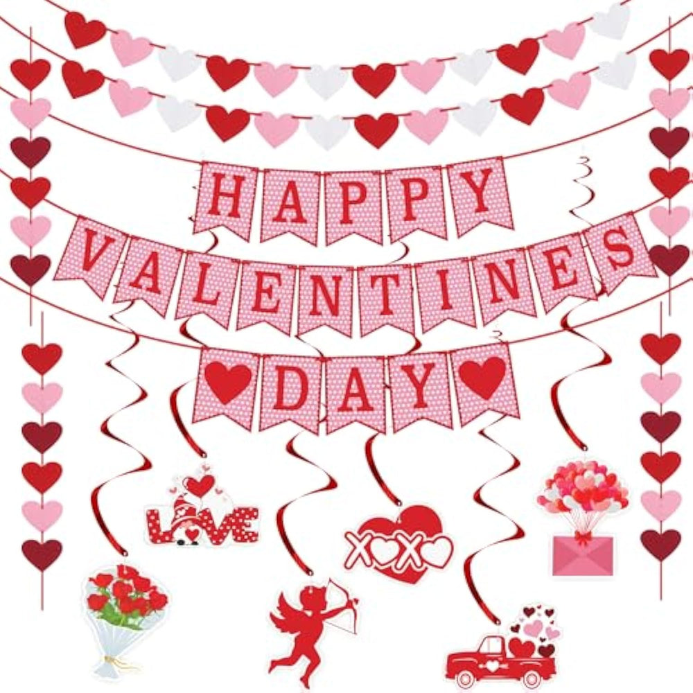 | Package Includes - You Will Get 2Pcs Red Pink White Felt Heart Banners, 2Pcs Red, Pink And Claret Felt Heart Garlands, 1 Happy Banner, 1 Valentines Banner, 1 Day Banner And 6Pcs Hanging Swirls With Paper Cutouts. 13Pcs In Total. | | Material And Size - These Heart Banners And Garlands Are Made Of Felt. The Happy Valentines Day Banner Is Made Of Cardboard. The Hanging Swirls Are Made Of Foil And Cardboard. All Banners And Garland Measures 9.84 Inches In Length. | | No Diy Require - All Parts In The Set Come Pre-Assembled And Ready To Use. Feel Free To Decorate Them On Walls, Mantels, Windows, Ceilings, Fireplaces, Bookcases, Shelves, Trees, Patios, Or Anywhere Else. It Will Add More Valentines Day Atmosphere To Your Home. | | Valentines Decorations - Happy Valentines Day Banners, Felt Heart Garland Banners And Hanging Swirls With Cute Paper Cutouts Such As Xoxo, Balloons, Cupid, Rose, Etc. Are A Good Choice For Home, Bedroom, Living Room And Other Decorations. Surprise Your Girlfriends And Loved Ones By Decorating Your Home With This Valentine'S Day Set. | | Suitable For Valentines Party Decorations, Wedding Anniversary, Valentine Theme Party Decor. Use Them To Create A Romantic Photo Spot That Will Wow Your Guests. | |