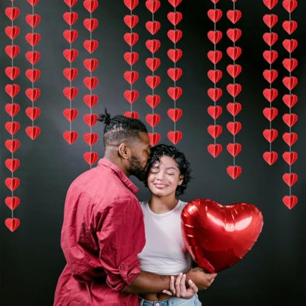 | ?Package Contains?4 Sets Of The Party Banner Garland,Each Is 9.84 Feet/ 3 Meters Long, Total Length Is 39Feet/ 12 Meters.Every Banner Has 30Pcs 3D Heart,The Size Is 1.97”Double Layers Paper. | | ?Material?The Heart Is 2 Dayers Paper, Please Open Them So They Can Have The 3D Effect. The Material Is Eco-Friendly Glitter Red Paper.You Can Cut To Any Length You Want If You Need Shorter Length.The Hearts Are Cut Very Neatly. | | ? Easy To Hanging ?Just Open The Package And Open The 2 Layers Heart Then Hang It Directly.They Have Been Sewn Together, Which Is Really Convenient For You. | | ?Using Occasion?They Are Perfect For Valentines Day,Galentines Day Decorations,Romantic Decorations Special Night,Heart Decor,Valentines Baby Shower Decorations,Bridal Shower,Girl Birthday Party,Baby Shower Decorations,Weddings,Bachelorette,Engagement,Mothers Day. | | ?Quality ?We Provide 48 Day Money Back And 24 Month . So Feel Free To