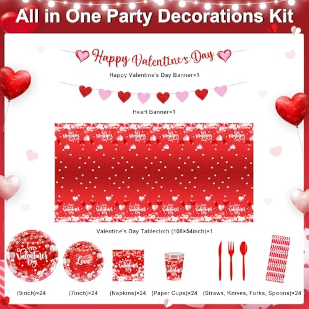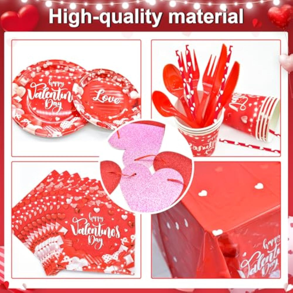 | Package Includes: 192 Pcs Valentines Dinnerware Set Including Plates, Napkins, Cups, Spoons, Forks, Knives, Straws And 1 Pc Happy Valentines Day Banner, 2 Pc Heart Banner, 1 Pc Valentines Table Cover | | Size: In The Package, Valentines Plates Measure 9 Inch And 7 Inch, Napkins Measure 6.5 X 6.5 Inch When Folded And 12.99 X 12.99 Inch When Unfolded, Valentines Table Cover Measures 53.94 X 107.87 Inch | | Material: Valentines Tableware Set Are Made Of Food-Grade Heavy Paper And Plastic, So It'S Safe For Both Adults And Kids. Valentines Banner Are Made Of Paper With Vibrant Pattern, Table Cover Is Made Of Plastic And Easy To Clean | | Occasion: Designed In Person, This Valentines Party Supplies Set Is A Great Choice For Valentins Party, Valentines Dinner, Valentines Theme School Events, Etc, Saving Your Time And Let You Enjoy Valentins Day Immersivelly | | Warm Tips: Please Do Not Heat Food With These Valentines Plates And Cups In Microwave Ovens | |