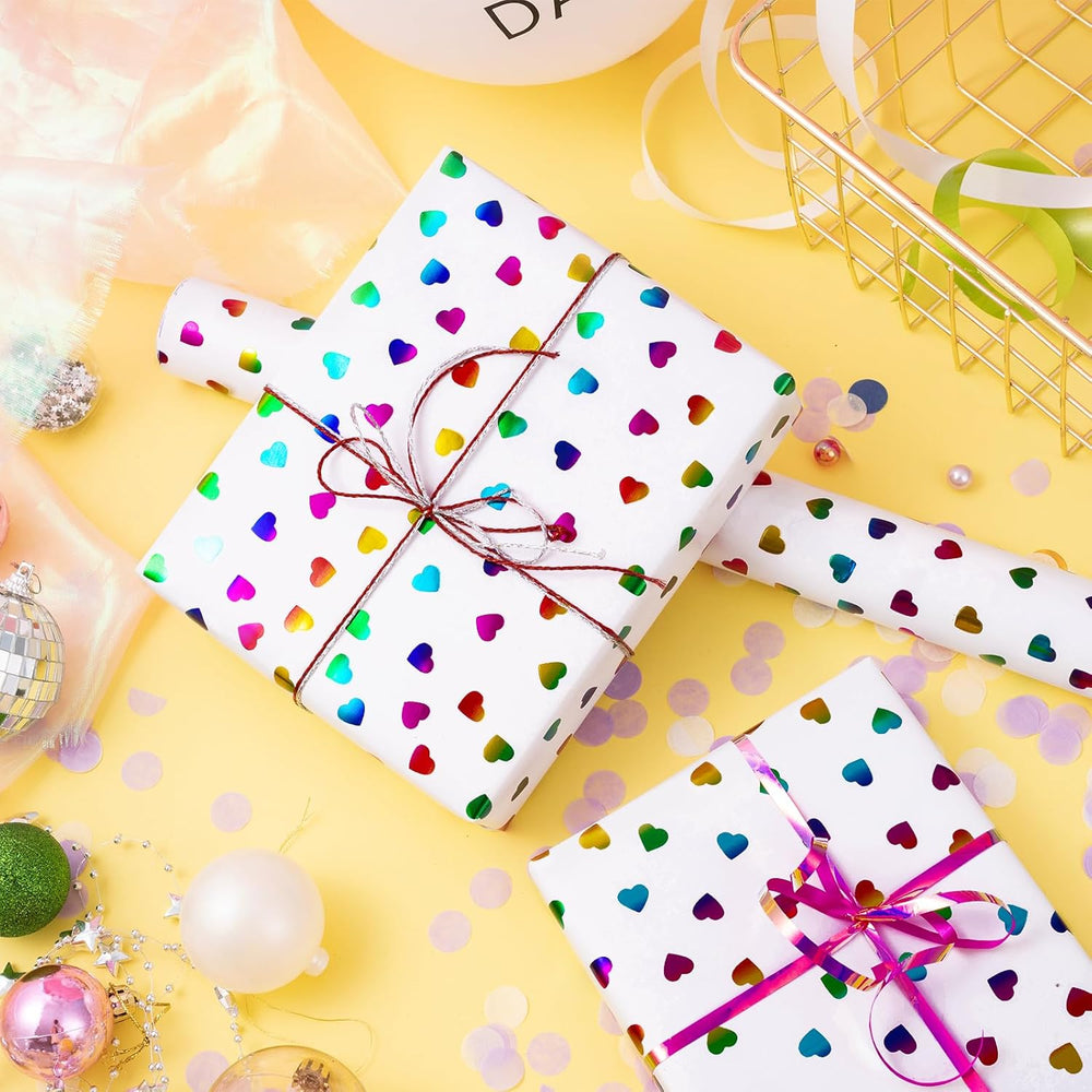| Hearts Design: Featuring With A Shimmering Pattern Of Multicolored Hearts, This Wrapping Paper Is Perfect For Adding A Touch Of Love And Elegance To Your Gift Packages. Make Your Gifts Stand Out With This Beautifully Adorned Heart-Themed Wrap. Holographic Foil: This Wrapping Paper Features A Stunning Holographic Foil Finish With A Captivating Rainbow Effect That Catches The Light From Every Angle, Creating A Dynamic, Eye-Catching Shimmer. The Iridescent Colors Add A Touch Of Modern Elegance, Making It Perfect For Special Occasions That Deserve An Extra Sparkle. Mini Roll: The Mini Wrapping Paper Measures 17 Inches Wide By 16.4 Feet Long For A Total Of 23.2 Square Feet. There Is Enough Paper To Wrapping Multiple Gifts, And Perfect For Small And Medium Gift. Premium Quality: Created With Durable Paper Materials, This Wrapping Paper Is Thick And Resistant To Tearing Or Ripping. The Item Is Packaged With Shrink Film To Protect It From Scratches And Minimize Dust Buildup. Perfect For Every Celebration: This Vibrant Heart-Patterned Wrapping Paper Is Ideal For A Variety Of Occasions, From Birthdays And Anniversaries To Valentine'S Day And Weddings. Its Colorful Holographic Hearts Make It A Great Choice For Both Kids And Adults, Adding A Playful Yet Elegant Touch To Gifts For Loved Ones. It’S Also Great For Craft Projects, Table Coverings, Diy Decorations, And Other Creative Endeavors.