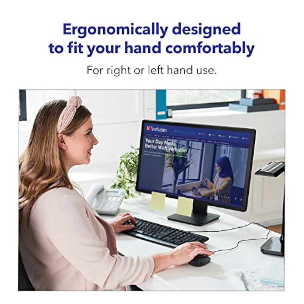 | Computer mouse with a contoured ambidextrous design that fits comfortably in your hand with a sleek, glossy finish | | Plug and play USB corded connection ready for instant use | | High-resolution optical technology for smooth and precise tracking; scroll wheel for smooth and precise scrolling | | Windows, MacOS, Chrome OS, Linux Kernel 2.6 and higher compatible | | Verbatim has been a leader in data storage technology since 1969, and s this product with a 1-year limited and technical support | |