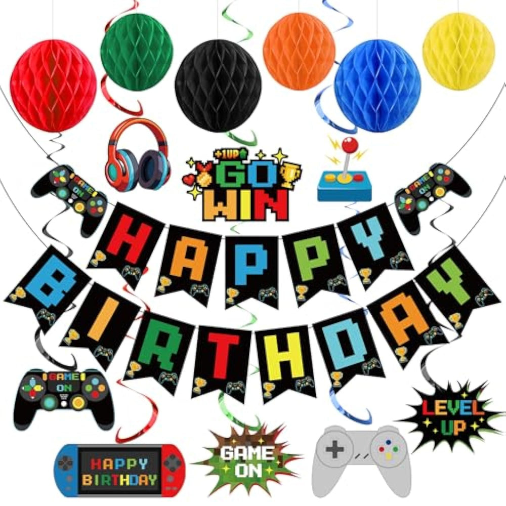 | Video Game Decoration Package: You'Ll Receive 6 Pcs Honeycomb Balls With 6 Colors, A Happy Birthday Banner, 8 Pcs Game-Themed Fancy Cards With 8 Single-Spiral Gold Foil Hangings. You'Ll Have Everything You Need To Perfectly Meeting Your Game Decoration Needs. | | Premium Material: This Video Game Themed Decoration Set Is Made Of High Quality Materials. The Strong And Lightweight Card Stock And Gold Foil Are Not Easily Damaged, Easy To Carry And Store, And Can Be Collected And Reused. Spiral Cards Are Printed On Both Sides In Bright Colors. Therefore, This Is Your Ideal Party Decoration Choice. | | Interesting Video Game Theme: This Video Game Element Birthday Party Decoration Comes With Banners And Card Stock With Vibrant Game Controller Element, Which Has A Strong Visual Impact. Whether It'S A Gathering Of Friends Or A Family Event, It Will Give You Great Memories Of Your Party. | | Easy To Assemble: Our Video Game-Themed Birthday Party Banners And Cards Are Very Easy To Assemble. The Decorative Set Has Pre-Cut Holes And Comes With A Needle And Thread. All You Need To Do Is Peel Off The Cellular Ball Stickers And Glue Them Together, And It Takes Just A Few Minutes To Install All Of Them. And Then You Can Enjoy The Party Moment To The Core. | | Wide Application: These Game Party Decorations Are Perfect For Birthday, Game Themed Parties. Taking This Gaming Party Decorations Package Home To Hold A Special Birthday Party For Your Kids, And Leaving A Good Memory With Your Friends And Family. | |