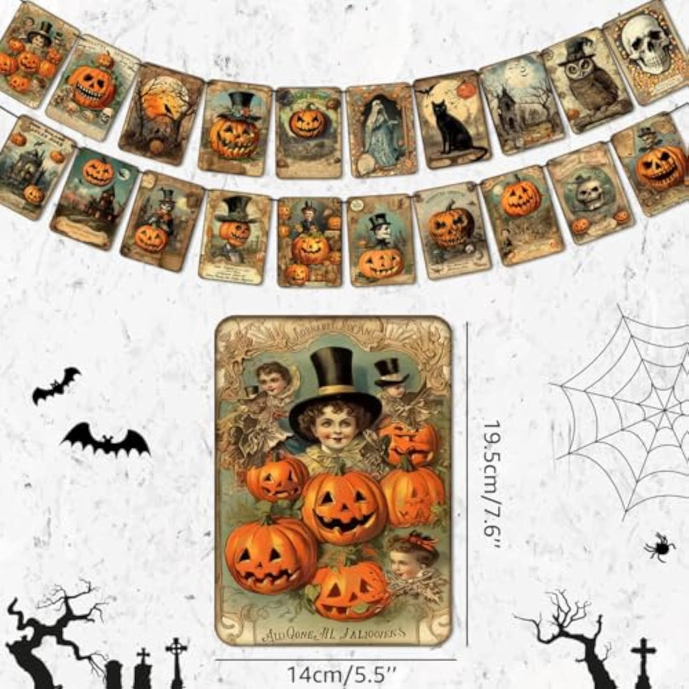 This vintage Halloween banner set includes 1 banner with 20 hard cardboard cards, each measuring 7.68" x 5.5", featuring retro designs with classic Halloween elements like pumpkins, cats, skeletons, castles, and dark colors. Crafted from high-quality, durable cardboard, the banners are lightweight, sturdy, and resistant to fading or tearing, ensuring long-term use. Each set comes with string and plastic pins for easy hanging. Perfect for Halloween parties, haunted houses, school events, or home décor, these banners can be displayed on walls, windows, fireplaces, ceilings, gardens, fences, and more, creating a fun, spooky, and visually striking atmosphere.