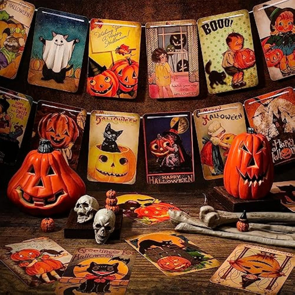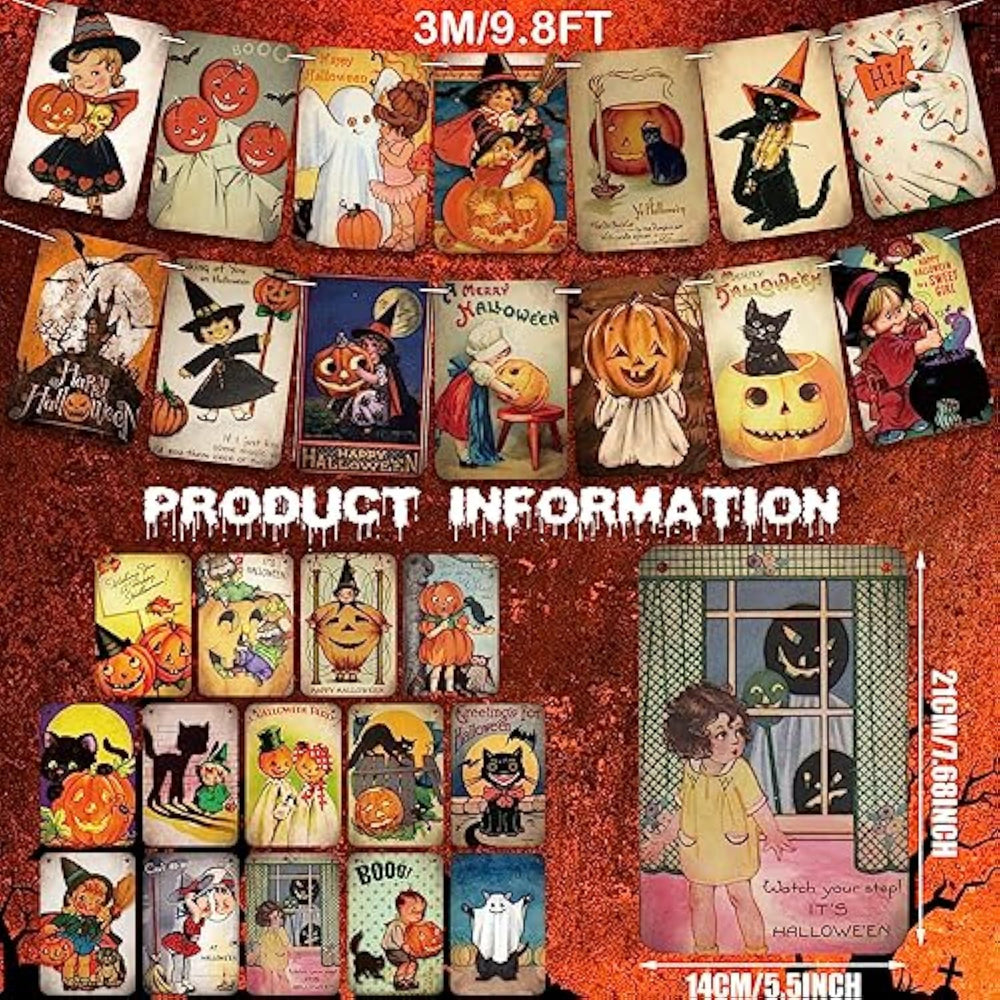This set includes four vintage-style Halloween banners with 28 cards featuring pumpkins, bats, ghosts, cats, and skeletons, offering a rich and festive combination for decorating. Made from sturdy, high-quality card paper, the banners are lightweight, durable, and resistant to fading or tearing. Perfect for Halloween parties, haunted houses, or seasonal displays, they can be used to adorn homes, yards, windows, walls, offices, and more, adding a classic and playful holiday atmosphere.