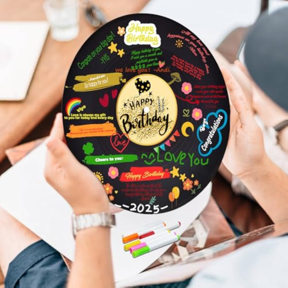 | Perfect Design: Birthday Vinyl Record Guest Book, A Display Shelf And 6 Color Pens. Give The Signature Vinyl Record To Your Relative Or Friend To Sign, And Then Put The Signature Vinyl Record In A Place You Like. Leave The Sincerest Wishes, Collect The Wishes Of Others, And Then Give The Signed Record As A Gift To Your Relative Or Friend. | | Suitable Size: Birthday Vinyl Record Is 29.5 X 29.5 Cm/ 11.6 X 11.6 Inch, Made Of High Quality Plastic, It Offers Perfect Durability. It Is The Same Size And Detail As A Vinyl Record, Giving It A Stylish Air. Your Guests Will Love Signing And Giving You A Special And Memorable Keepsake. (Note: Because It Is A Plastic Product, The Surface Will Have White Water Texture, Which Is A Normal Phenomenon.) | | Unique Creative Gift: The Farewell Records Of The Farewell Parties Have Plenty Of Space For Handwriting And Drawing, And Are Great Conversation Pieces For Many Occasions; Your Guests Will Love Autographs And Give You A Special And Memorable Souvenir, An Excellent Gift Choice For Birthday Parties Occasions. | | Perfect For Any Room: A Vinyl Personalized Souvenir Can Be Displayed In Any Room Of A Home Or Office As A Precious Reminder Of Their Hard Work And Achievements. | | Wide Application: Creative Birthday Guest Sign In Vinyl Record Perfect As A Decoration For Birthday Parties For You, Your Family, Friends, Or Coworker. It Is Your Ideal Birthday Party Decoration, Will Shine Brightly At Your Birthday Party,Creating A Warm Atmosphere For Your Party. | |