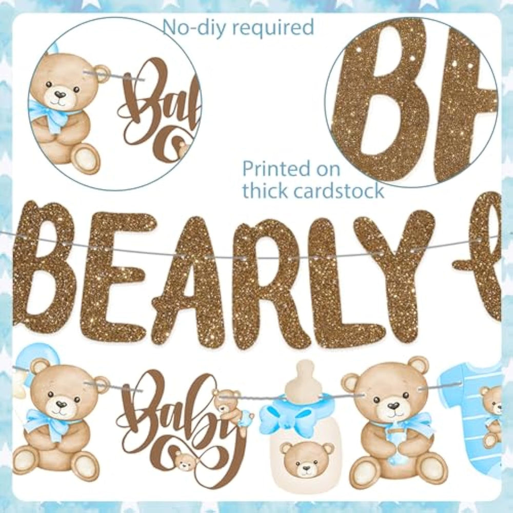| ???We Can Bearly Wait Banners?The Package Includes 3Pcs Bear Baby Shower Banners, 1Pcs Banner With The Letter ’We Can’, 1Pcs Banner With ‘Bearly Wait’ And 1Pcs Blue Teddy Bear Cutout Banner. The Size Of The Prominent Enough We Can Bearly Wait Sign Is Sure To Make A Visual Impact At Your Party. | | ???Bear Baby Shower Decoration?Pre-Strung And Neatly Arranged Teddy Bears And Slogans Are Suitable For All Kinds Of Parties Including Bear Baby Shower Party, Teddy Bear Birthday Party, We Can Bearly Wait Party, Cartoon Party, Animal Party Or Other Happy Moments. | | ???Teddy Bear Party Banners?No Need To Worry About The Quality, Our Bear Baby Shower Supplies Is Made Of High Quality Material. The Sturdy Cardstock Cutout And Unbreakable Rope Allow You To Use It For A Long Time. | | ???We Can Bearly Wait Baby Shower Supplies?Just Need To Easily Hang This We Can Bearly Wait Baby Shower Banners To Embellish Your Room, Doorway, Garden, Classroom Or Even Office To Give You The Cozy Atmosphere Of A Bear. | | ???Bear Birthday Party Supplies For Baby Boy?Celebrate The Arrival Of A Baby Boy! Designed Specifi