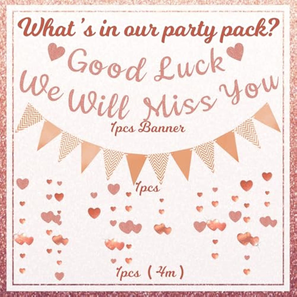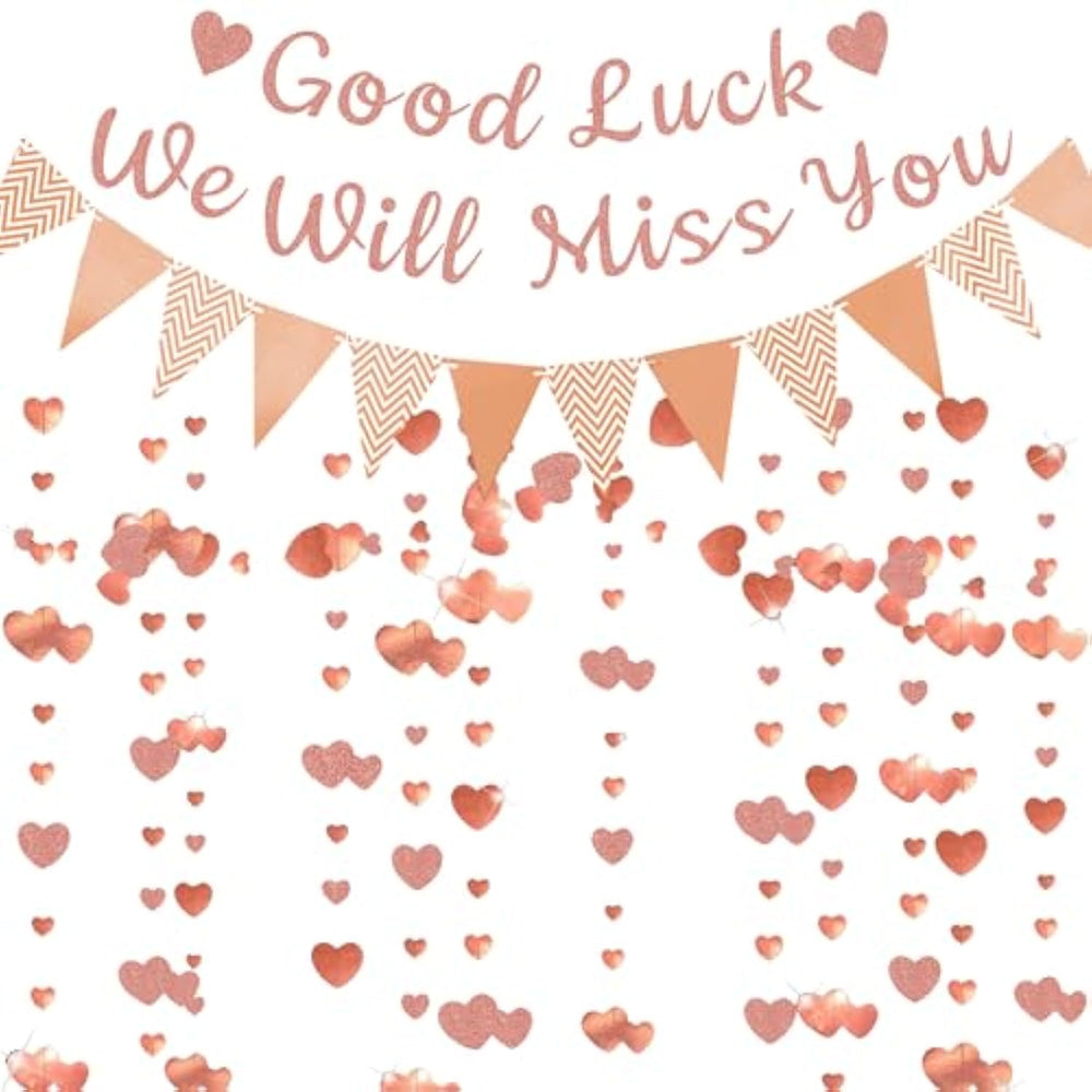 | Product Details: Rose Gold We Will Miss You Decorations Includes 2 Banners, 12 Pennants, 1 4M Garland, This Banner Encourages Heartfelt Messages, Laughter And Celebration, Making It A Must-Have For Any Farewell Party | | Enhance The Atmosphere: This Good Luck Decorations Serves As The Centerpiece Of Your Farewell Decorations Party, Allowing Guests To Express Their Emotions. The Beautiful Design Makes It Easy To Pair With Farewell Balloons And Other Goodbye Decorations For Coworkers, That Will Leave Lasting Memories For Everyone | | Memorable Keepsake: This Farewell Party Decorations Is Not Just For The Moment; It Becomes A Cherished Memento For The Guest Of Honor. As Friends And Coworkers Gather To Bid Farewell, They Can Reminisce And Share Stories, Creating A Memorable Experience | | Easy Setup And Display: The Good Luck Banner Is Conveniently Designed, Lightweight And Easy To Use. You Can Easily Install It In Minutes, You Need To Thread It, And Then Hang It Indoors Or Outdoors, Making Your Going Away Party Preparations A Breeze | | Versatile Party Decor: Good Luck We Will Miss You Banner Is Suitable For Various Going Away Gatherings, Including Graduation, Retirement, Farewell Parties For Coworkers, Or Any Goodbye Celebration, Conveying Heartfelt Well-Wishes To Those Departing | |