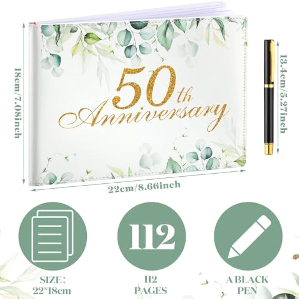 | Exquisite Design: This Beautifully Designed 50Th Anniversary Sign In Book Features Eucalyptus Leaves And Gold Copy, Complemented By A Beautifully Crafted Leather Cover To Express Blessings; The Exquisite Appearance Provides A Beautiful Reference For Your 50Th Anniversary Party, Which Can Be Showcased And Appreciated In The Years To Come | | What You Get: You Will Receive One 50Th Anniversary Attendance Book And One Black Signature Pen, Exceeding The Regular Guest Book That Only Records Names; This Souvenir Can Help You Record And Preserve The Blessings Of Friends And Family Towards You, Creating A Meaningful And Lasting Celebration Memory That Can Be Cherished Forever | | Proper Size: The Size Of This 50Th Anniversary Attendance Book Is Approximately 8.7 X 7.1 Inches, Providing Ample Writing Space And Equipped With A Black Signature Pen; You Can Easily Place It In Certain Areas On The Wedding Party Table, It Won'T Take Up Too Much Space And Is Also Convenient For You To Use, Providing Convenience For Your Life | | Reliable And Serviceable: This Wedding Guest Book Consists Of 112 Pages And Is Made Of Thick And Reliable Paper Material, Which Can Be Applied For A Long Time; The Cover Is Made Of Soft Leather Material And Bound With Cardboard, So That