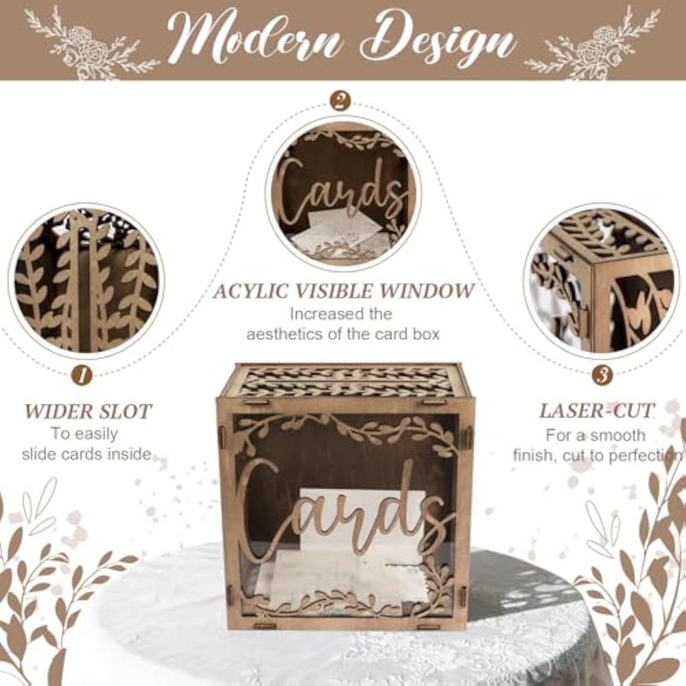 | High-Quality Materials: Money Box From Premium Wood Material Each Gift Card Box Is Laser Cut, Sanded Twice, And Finished With A Beautiful Walnut Stain Complemented By A Clear Acrylic Window, These Card Boxes Add An Elegant Touch To Your Wedding Reception Decorations And Blend Seamlessly With Any Rustic Wedding Decorations. | | Unique Design: Romantic Willow Leaf Window Hollowed Out, “Cards” Carved In The Middle Of The Newly Named Box, Unique And Charming, You Can See The Contents Of The Clear Card Box Through The Transparent Window. The Natural Wood Grain And Warm Tones Create A Cozy And Inviting Atmosphere, Setting The Perfect Backdrop For Your Celebration. | | Extra Large Size: Measuring 10 X 10 X 5.9 Inches, This Card Box For Party Provides Ample Space To Accommodate 150-300 Cards And Envelopes. The Top Of The Wooden Boxes Are Designed With A Card Slot Measuring 6.8 Inches, It Easy For Guests To Drop In Their Well Wishes And Monetary Gifts, Ensuring A Smooth And Organized Process Throughout The Event. | | Easy Installation: The Wedding Card Boxes For Reception Include 6 Sides Of The Card Box, 1 Installation Instruction, And Some Rubber Bands To Secure The Box. The Easy-To-Follow Instruction Sheet Is Included With Every Graduation Card Box. Easy To Assemble Into A Durable Box Within Minutes Or Disassemble To Store Away, And Provide Installation Video Guidance. | | Multiple Occasions: The Acrylic Card Box Is Perfect For Wedding Shower Decorations, Birthdays, Anniversaries, Bridal Shower Decor Quinceanera Decorations, And More Events! You Can Personalize The Card Box To Match Your Wedding Theme Or Personal Style. Add Decorative Accents Such As Ribbons, Flowers, Or Signage To Customize The Box And Make It Uniquely Yours. | |