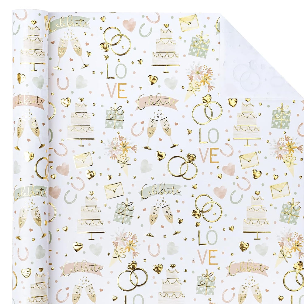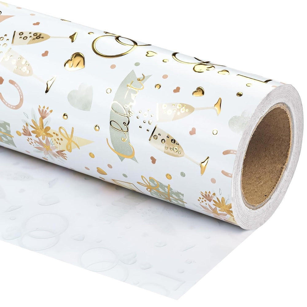 | Perfect Size: Each Roll Measures 17 Inches Wide X 16.5 Feet Long, Which Provides You With A Total Of 23.25 Square Feet Of Paper. It'S Perfect For Any Small Or Medium - Sized Gift And Is Also Very Convenient To Store. Wedding Design: Gold Foil Cheers, Wedding Rings, Hearts, Gift Boxes, And “Celebrate” “Love” Lettering With 3D Embossing Add A Touch Of Luxury And Elegance. It Will Make Your Gift - Wrapping More Textured, Stylish, Yet Special. Premium Quality: Created With High-Quality Paper Materials, Thick And Not Easily Tear Or Rip. Item Came With Shrink Film To Prevent Wrapping Paper From Scratches And Reduce Dust. Use All Occasion: Ideal For Multiple Occasions Such As Weddings, Anniversaries, Valentine'S Day, Or Any Celebration That