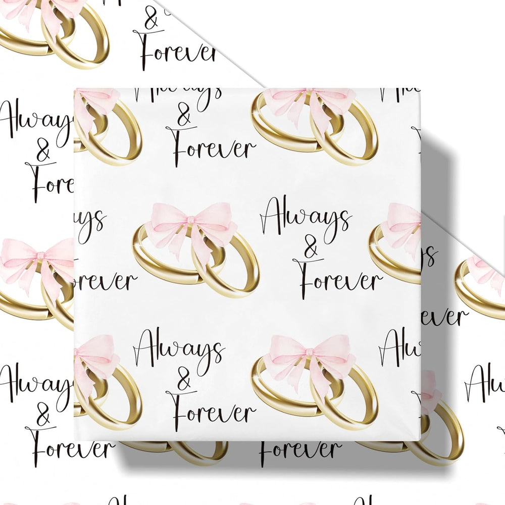 | Romantic Design: This Wrapping Paper Features The Heartfelt "Always Forever" Text Paired With Golden Wedding Rings And Soft Pink Bows. Perfect For Expressing Love And Commitment On Weddings, Anniversaries And Bridal Showers Easy To Store: The 17 Inches Wide By 16.4 Feet Long Is Designed For Convenience. The Compact Size Suitable For Small And Medium Gift Wrapping Paper, While Being Easy To Store Among Your Craft Supplies High-Quality Paper: Crafted With Durable Paper, This Gift Wrap Offers Excellent Strength And Reliability. Tear-Resistant And Durable, It Ensures Your Gifts Stay Beautifully Wrapped Without Ripping Or Wrinkling Practical Wrapping Solution: Crafted From Durable, Responsibly Sourced Materials, Our Wrapping Paper Is Designed With Minimal Waste In Roll Packaging And A Natural Look. Its Sturdy Design Allows For Multiple Uses, Offering A Stylish And Eco-Conscious Choice Elegant And Stylish: The Combination Of Elegant Gold Rings, Pink Bows, And The Timeless Message Creates A Beautiful, Romantic Theme, Ideal For Wrapping Gifts For Newlyweds, Anniversaries, Or Bridal Events. Its Chic Design Makes Any Gift Look Sophisticated And Thoughtful.