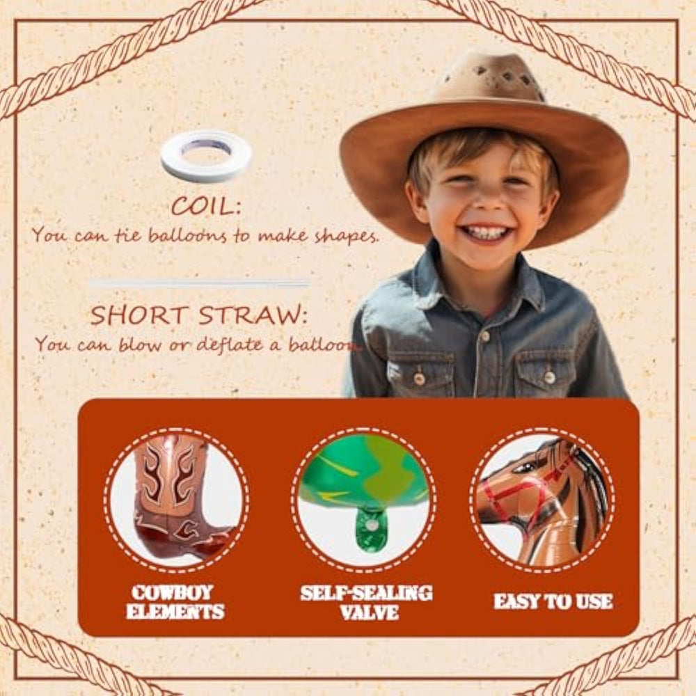 | Package Includes: 5 Western-Themed Balloons –1 Cowboy Hat Balloon, 1 Horse Balloon, 1 Boot Balloon, 1 Horseshoe Balloon, 1 Cactus Balloon. These Vibrant Cowboy Decorations Will Add A Fun And Unforgettable Touch To Your Party! | | Balloon Size: 5 Western-Themed Balloons –1 Cowboy Hat Balloon(25 × 17 In), 1 Horse Balloon(22 × 32 In), 1 Boot Balloon(17 × 23 In), 1 Horseshoe Balloon(19× 23 In), 1 Cactus Balloon(15 × 22 In). | | Exquisite Design: Elevate Your Celebration With These Eye-Catching Balloons! Featuring Classic Western Patterns And Vibrant Colors, They Create A Lively, Festive Atmosphere. Perfect For Cowboy And Cowgirl-Themed Parties, Birthdays, Baby Showers, And More! | | Warm Tips: To Keep The Balloons Durable, Avoid Over-Inflating. These Foil Balloons Have A Self-Sealing Valve For Easy Inflation. Please Note: They Will Not Float, Even If Filled With Helium. | | Party Decorations: Perfect For Western-Themed Birthdays, Cowboy And Cowgirl Parties, Celebrations, Anniversaries, Christmas, Halloween, And More! These Versatile Balloons Bring A Fun Cowboy Touch To Any Event And Make A Great Gift. | |