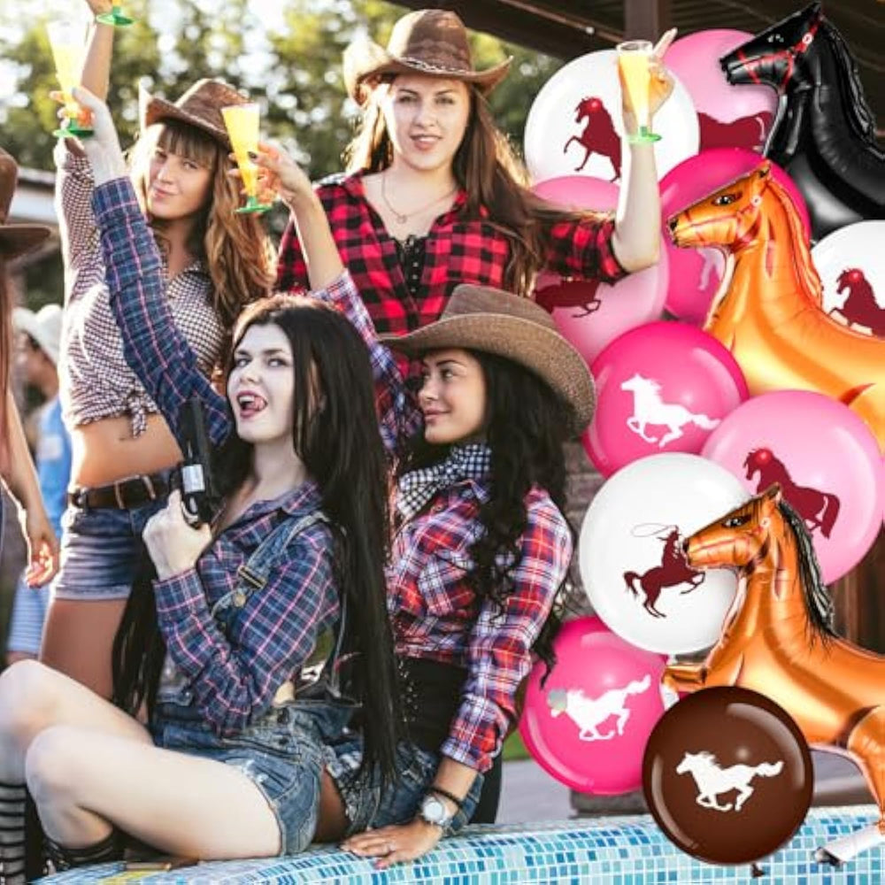 Bring western charm to your party with this horse-themed balloon set! It includes 4 large 40" horse-shaped foil balloons, 40 printed 12" latex balloons featuring cowboys, cowgirls, and galloping horses, plus pink and brown ribbons for decorating. The foil balloons are made of durable, high-quality aluminum, while the latex balloons are thick and sturdy—perfect for air or helium. With their vibrant designs and colors, these balloons are ideal for birthdays, baby showers, or western-themed events, making your celebration lively and unforgettable.