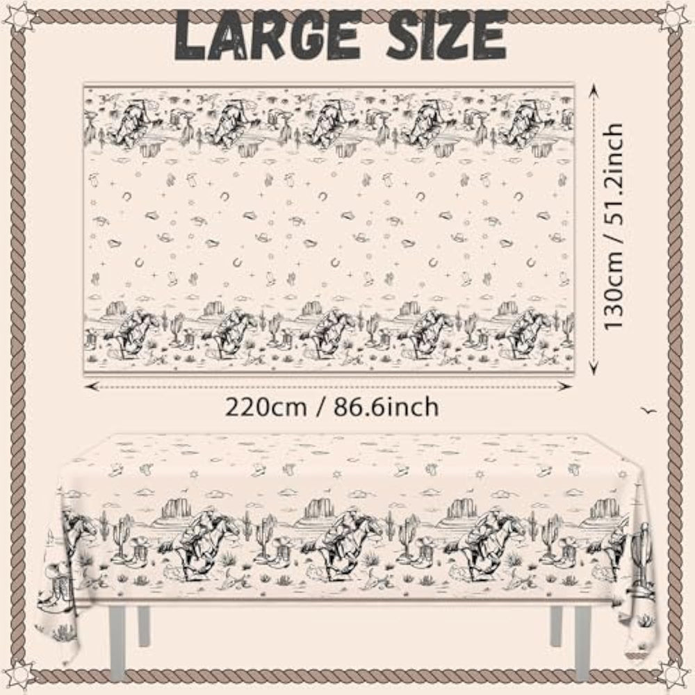 | Size:Package Includes 3 Pieces Of Cowboy Theme Party Decorations, Measuring 86.6X51.2 Inches/220X130 Cm, Large Enough To Decorate Your Party, Suitable For Rectangular Tables, Indoor And Outdoor Applications. Western Party Tablecloth Can Decorate The Dining Table For Your Cowboy Party, Making It Memorable And Unforgettable | | Design:Cowboy Table Decorations Tablecloths Are Printed With Western Desert Scene, Cowboys, Horses, Cacti, Cowboy Boots And Skulls. All Of These Can Add More Happy Atmosphere To Your Gathering | | Material:Cowboy Birthday Table Cloth Is Made Of Thick, Oil Resistant And Waterproof Plastic. Cowboy Baby Shower Tablecloths Have No Odor And Are A Safe Material For Your Children Or Guests Attending Parties | | Easy To Use:After The Party, You Can Roll The Wild West Tablecloths Up And Throw It Away, And Spend More Time Enjoying Your Party Time. If The Western Table Cloth Gets Dirty, You Can Easily Clean It With Cloth Or Paper! Reusable With Appropriate Care | | Wide Application:Rodeo Disposable Tablecloths Are Suitable For Cowboy Birthday Parties, Wild West Parties, Cowboy Baby Shower, Rodeo Theme Parties, Camping, Buffet, Picnics And So On. This Cowboy Birthday Decorations Will Be The Center Of Attention At The Party, Your Friends And