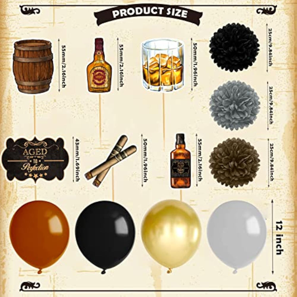 Celebrate in style with this Whiskey Birthday Party Decoration Pack – perfect for men’s birthday celebrations or "Aged to Perfection" themed events. This all-in-one set includes a birthday banner, whiskey-themed garland, foil whiskey bottle and star balloons, a cake topper, cupcake toppers, latex balloons in four colors, and tissue paper pom-poms. Made with high-quality cardstock and durable latex, the set is easy to assemble with included ribbons and a plastic needle. Ideal for birthdays, retirements, or any whiskey-loving celebration!