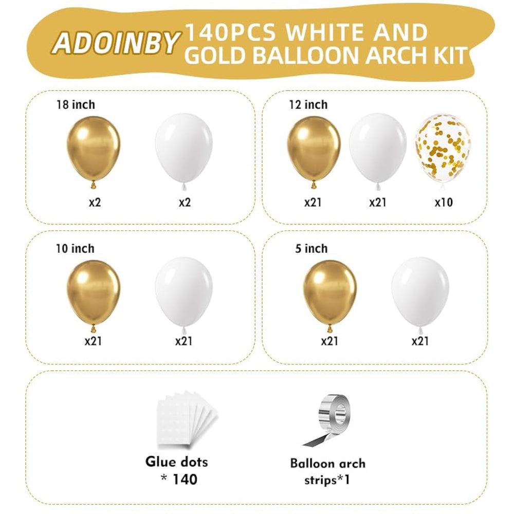 | ?White And Gold Balloon Garland Kit?:Include 140Pcs Balloons 18''(White Balloons 2, Gold Balloons 2),12''(White Balloons 21, Gold Balloons 21, Gold Confetti Balloons 10), 10''(White Balloons 21, Gold Balloons 21),5''(White Balloons 21, Gold Balloons 21),16Ft Garland Strip X1,140 Dots Glue. | | ?Best Quality?:The White And Gold Balloons Is Made Of High Quality Latex, The Leather Is Thick, Not Easy To Burst, And The Color Is True. High-Quality Latex Allows The Balloon To Stretch Well When Inflated. Adding Helium Can Make The Balloon Float. Don'T Worry If The Balloons Are Leaking, They Can Last A Long Time. | | ?Easy To Assemble?: White And Gold Balloon Arch Kit Is Very Easy To Assemble, Enjoy The Fun Of Diy. Inflating Is Easy And You Can Hang Them On Trees, Walls, Windows, Doorways, Dining Tables And Anywhere You Like. Decorate Weddings, Bridal Baby Showers, Engagement Anniversaries, Birthday Decorations And Any Party You Can Think Of. | | ?Suitable For Any Occasion?:The White And Gold Balloons Are Very Pretty And They Are Widely Used For A Variety Of Theme Parties Such As Wedding, Christmas, Birthday, Anniversary, Baby Shower, Or Other Celebrations. You Can Make These Gold And White Balloons Into Balloon Garland Arch, Or Mix And Match With Other Colors. | | ?Note?:There May Be Some Smell Of Latex When The White And Gold Balloon Garland Arch Kit Is Just Taken Out, You Can Dry It In A Cool And Ventilated Place. To Avoid Dust Dimming The Balloons, You Can Set Up The Balloons Shortly Before The Event Or Use Balloon Shine Spray To Keep Them Shiny. | |
