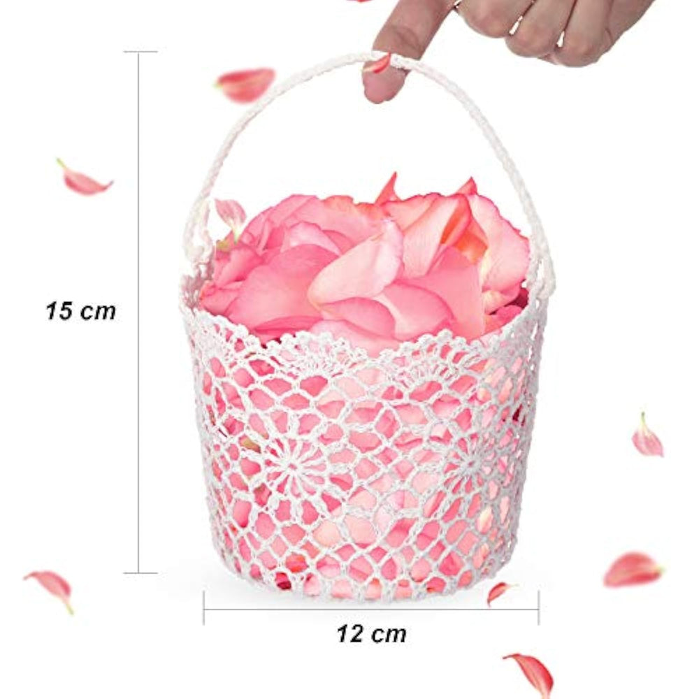 | Romantic Scene: Use The Flower Girl Basket To Scatter The Petals On The Aisle To Bless Your Wedding With Fertility Abundance Romantic And Happiness | | Durable Feature: The White Flower Basket Is Crocheted By Hand, Made Of Cotton Line Material, Attached With Basket Handle, Sturdy Enough To Hold | | Wide Application: These Flower Baskets Are Great For Decorating Home As A Fruit Basket On The Desk Or Full Candy On Party Table; Warm Note: Please Fix The Shape Of The Product Before You Use It | | Adorable Size: Approx. 5.90 X 4.72 X 4.33 Inch/ 15 X 12 X 11 Cm, The Cute Flower Baskets Are Light Weight And Easy Carried By The Little Girl | | More Other Uses: Come With 4 Packs Wedding Baskets For Wedding Flower Girl And Boy, They Are Also Good For Girl Picking Food, Fruits And Playing In Garden | |