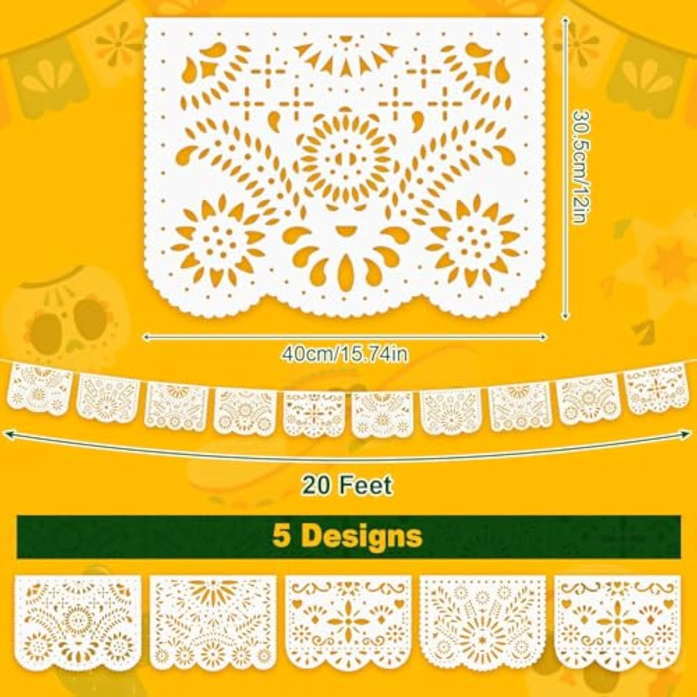 | Package Content: You Will Receive 1 Piece White Papel Picado Banner, Including 10 Exquisite Flags, With 5 Unique Designs, So That You Can Easily Decorate The Whole Venue And Bring A Strong Celebration Atmosphere | | Reliable Materials: These Cielito Lindo Party Decoration Is Made Of Good-Quality Plastic Materials, Which Have Wonderful Durability And Are Not Easy To Fade, Tear Or Damage. Even If Experience Wind, Rain And Sunshine Outdoors, Mexican Fiesta Decorations Can Maintain Vivid Colors And Good Shape, Ensuring Lasting Decorative Effects And Add More Joy To The Activities | | Appropriate Size: The Length Of The Mexican Party Supplies Is 20 Feet, And The Size Of Each Mexican Flag Is 40X30 Cm, Which Can Easily Cover A Large Space, Create Eye-Catching Visual Effects And Add Highlights To Your Activities | | Easy Installation: The Mexican Decorations For Party Are Equipped With Attached Rope, And The Installation Process Is Fast And Simple. You Just Need To Hang Fiesta Banner On The Wall, Trees Or Anywhere You Want To Decorate, And You Can Easily Finish The Decoration. Whether Indoors Or Outdoors, Mini Papel Picado Banner Can Add Colorful To Your Activities, Save Time And Energy, And Make You More Focused On Party Fun | | Widely Used: Cielito Lindo Party Decoration Is Very Suitable For Various Occasions, Such As Mexican Wedding Decoration, First Communion, Baptism, Day Of The Dead, Mexican Independence Day, Birthday Party, Anniversary And More, Adding A Unique Style And Atmosphere To Your Celebration. Whether Indoor Decoration Or Outdoor Celebration, The White Papel Picado Banner Is The Ideal Choices To Help You Create Unforgettable Memories | |