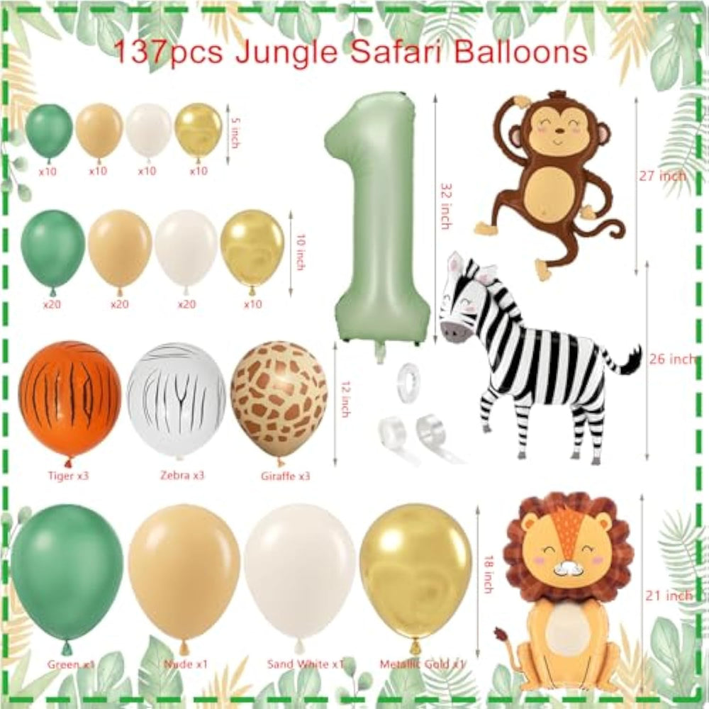 | ?? Wild One Birthday Party Supplies --- Transform Your Space Into A Magical Wilderness With Our 1St Birthday Party Decorations! This First Birthday Party Decor Pack Includes - 1 Wild One Backdrop,1 Photo Banner, 1 Crown, 1 Cake Topper, 1 Highchair Banner, 2 Milestone Posters, 5 Monstera Leaves,4 Foil Balloons, 123 Latex Balloons For Creating Stunning Jungle Foliage, Every Piece Works Together To Create An Safari Wonderland! | | ?? Premium Eco-Conscious Materials --- We Prioritize Safety And Sustainability. Vibrant, Fade-Resistant Prints, Non-Toxic, Biodegradable Latex Balloons Are Safe To Your Baby And Bring A Long-Lasting, Striking Decorations That Withstand The Excitement Of Your Little Explorer'S Special Day.Heavy-Duty Fabric Backdrop Banners Are Reusable For Future Events, Not Only The 1St Birthday Decorations For Your Baby Boy. | | ??Create Your Own Safari Balloon Arch In 4 Easy Steps: ? Build Your Garland :Inflate Balloons To Varying Sizes. Thread Onto The Hole Arch Strip. Secure With Ribbons And Use The Glue Dots To Stick Balloons To Your Ideal Shape.? Assemble Highlights: Hang Animal Foil Balloons As Focal Points. Display ""Wild One"" Backdrop And Cake Topper Prominently. ? Personalize Touches: Add Monthly Milestone Photos To The Banner, And Put The Milestone Posters In The Frame. ? Crown Your Birthday Star With The Safari Crown. With All Safari 1St Birthday Decorations Will Bring You A Unforgetable Birthday Party. | | ?? The Safari Birthday Decorations Are Versatile For Any Celebration. Perfect For: 1St Birthday Party (Highchair Banner Included) Jungle-Themed Baby Showers Outdoor Safari Picnics Rainforest Animal Theme Party Nursery Room Makeovers Zoo Animal Photoshoots And So On. | | ?? Complete Kit = Big Savings. Everything You’Ve Ever Thought Of For Your Baby'S One Year Old Birthday Party Is Now In This Wild One Themed Set. Compared To Buying Pieces Separately, This Set: ? Saves You Time And Money ? Ensures Perfect Color Coordination ? Delivers Professional-Quality Results ? Includes Everything But The Cake! | | ??Attention: Please Use An Electric Or Hand Pump To Inflate The Balloons, Do Not Inflate The Balloon More Than 90% To Avoid Sudden Popping. Balloon Colors May Vary From Different Monitors And Screens. Talcum Powder Were Used To To Prevent The Balloons From Sticking To Each Other And Extend The Balloons' Lifespan, So You May Find A Little Powder In The Package. | | ??Please