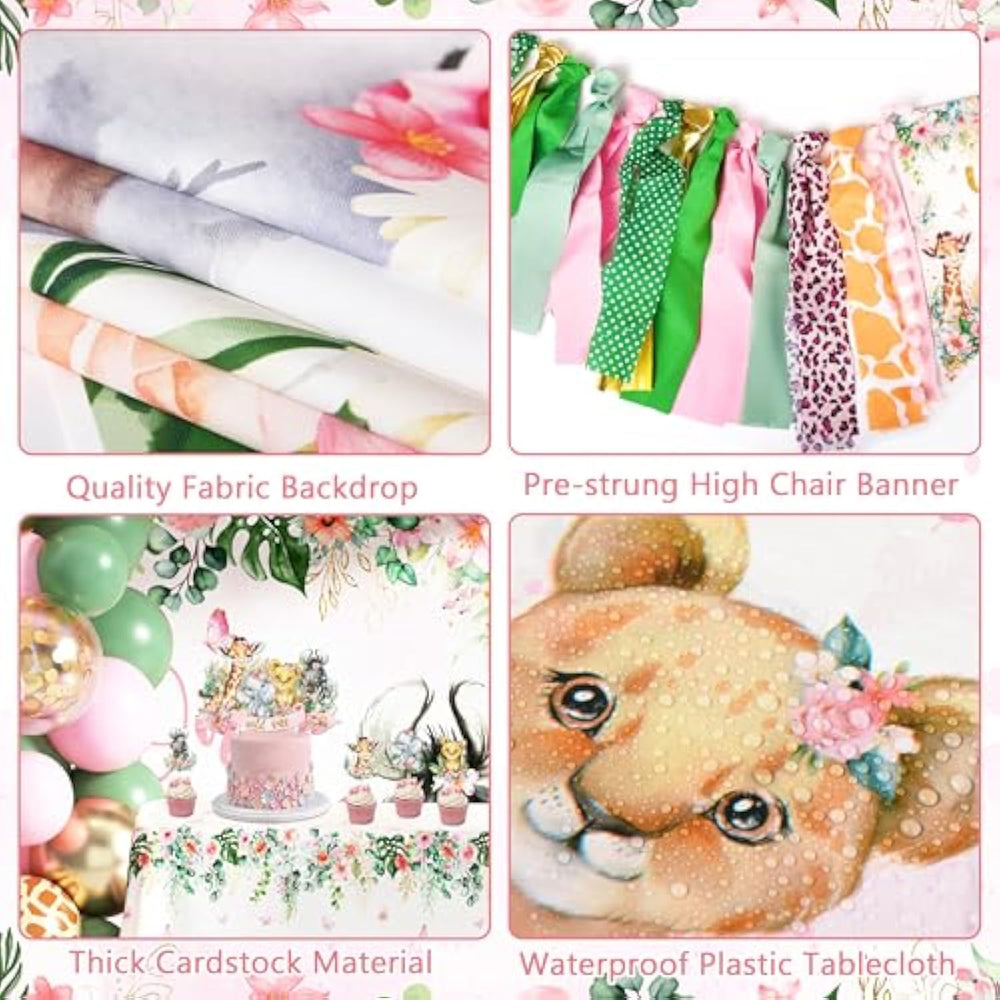 | Wild One Birthday Party Decorations----You Will Get 1 Wild One Backdrop, 1 Tablecloth, 1 Milestone Poster, 1 Photo Banner, 1 Cake Topper, 12 Cupcake Toppers, 1 "One" Birthday Crown Hat, 1 High Chair Banner, 3 Foil Balloons, 3 Balloon Blocks, 2 One Stickers, 12 Artificial Leaves, 75 Latex Balloons, 114 In Total. | | Vibrant Playful Design----Our Backdrops And Tablecloths Are Printed With Tropical Jungle And Small Animal Patterns On Them, Which Are Colourful And Not Easy To Lose Colour. The Lion And Giraffe Shaped Foil Balloon Are Vivid And Fit The Theme Of The Animal Party.Get Ready To Liven Up Your Celebration! | | High-Quality Materials----Balloons Are Crafted From Premium Latex, Ensuring A Safe And Non-Toxic Experience. We Use Cardboard For Cake Toppers, And Our Backdrops Are Wear-Resistant And Waterproof Vinyl. Crown Hat And Artificial Leaves Are Designed To Be Highly Realistic. | | Easy To Assemble----The Package Also Comes With 3 Balloon Tools Including Balloon Chain, Glue Points, Ribbon That Will Help You Build The Perfect Safari Balloon Arch.The Balloon Box Is Pre-Folded, Just Follow The Folding Marks, You Will Get A Perfect Box In No Time, You Can Also Diy The Box According To Your Preference. | | Wide Application----The Party Pack Is Suitable For Many Occasions, Such As Wild One Birthday Party, First Birthday Decorations For Girl Party, Safari Theme Party, One Year Old Birthday Party, Jungle Safari Animal Party, Wild Ones Baby Shower Party, Rainforest Animal Theme Party. | |