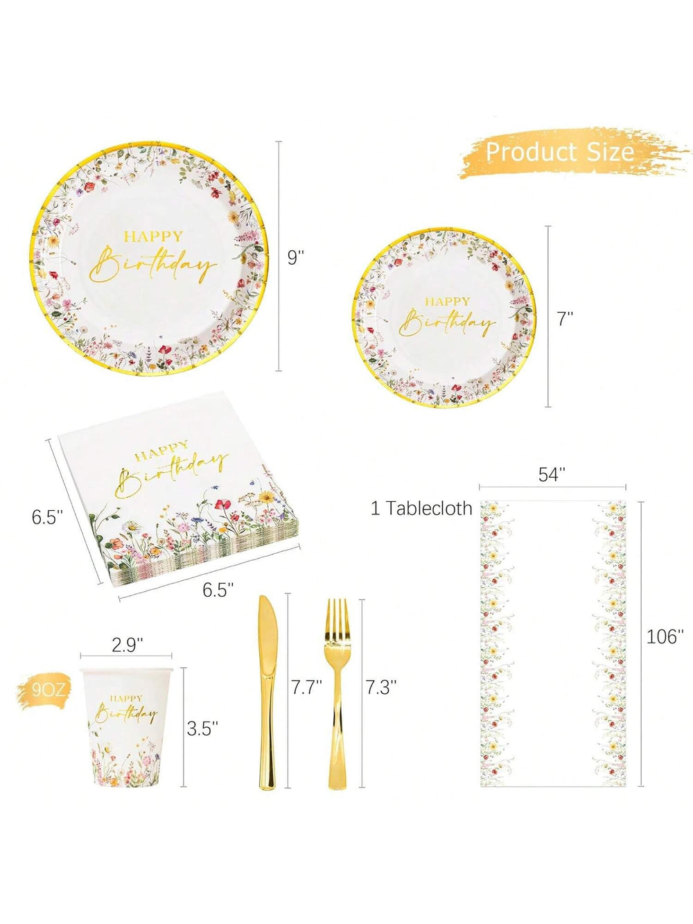 [Sever for 24 Guests]: This party dinnerware set comes with including 9" dinner paper plates *24, 7" paper dessert plates *24, 9oz paper cups *24, luncheon napkins (3-ply and measuring 6.5" x 6.5") *24, plastic knives and forks *24, 106"*54" Tablecloth *1