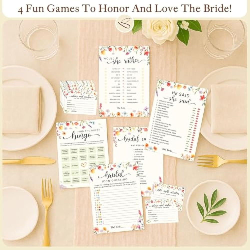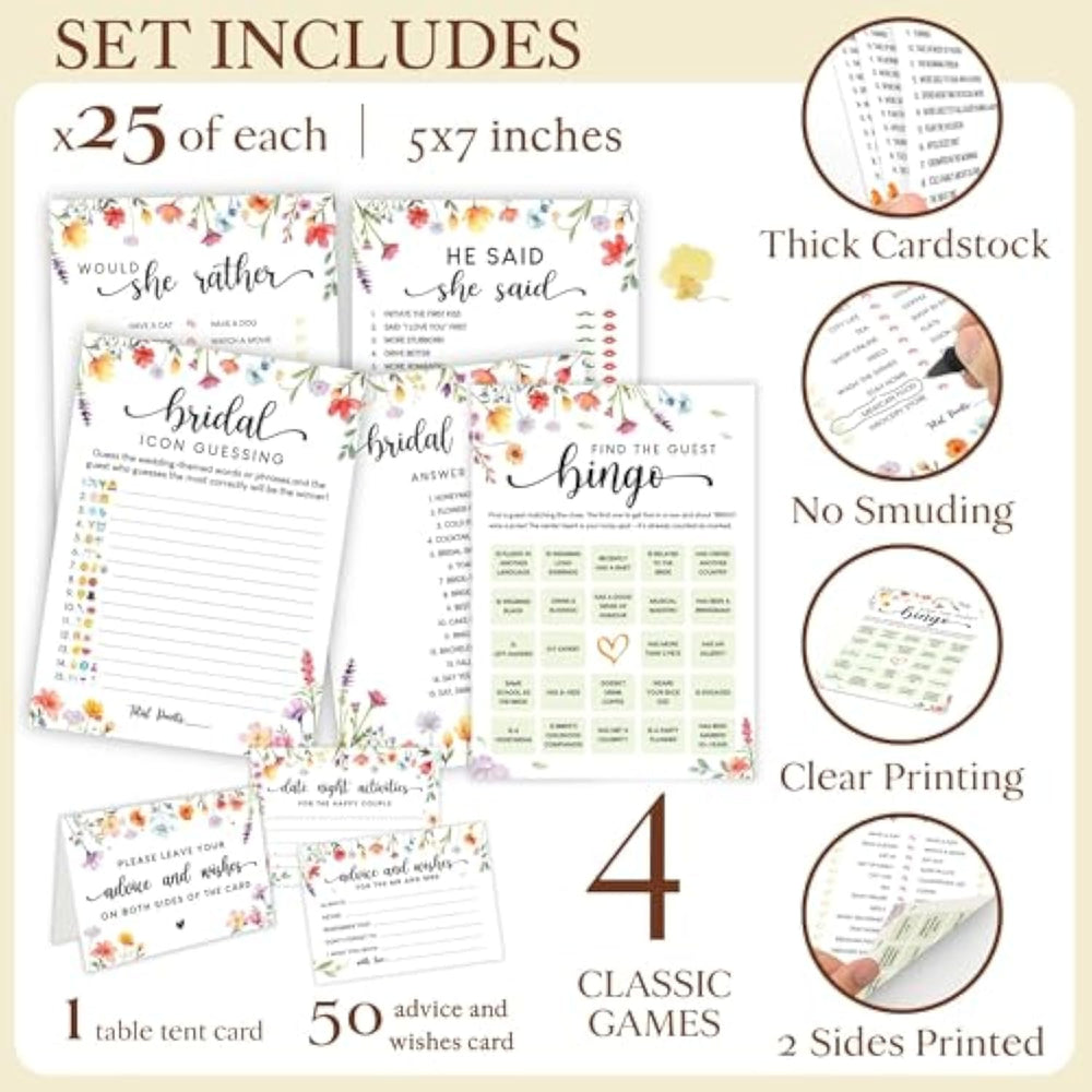 | Bridal Shower Game And Advice Cards: Make Your Event Unforgettable With Classic Games Like Bridal Shower Bingo, Would She Rather Bridal Shower Game, And He Said She Said Bridal Game—Plus Heartfelt Bridal Shower Advice Cards And Wedding Advice Cards. | | Set Include: Includes 4 Fun Games (25 Of Each), 50 Advice And Wishes Cards, And 1 Table Tent Card—Perfect For Advice Cards For Bridal Shower, Bridal Shower Advice And Wishes Cards, And Wedding Activities. | | Gift Idea: A Meaningful And Fun Gift Idea For Bridal Shower Hosts Or Bridesmaids, Great For Bridal Shower Favors, Bridal Shower Party Favors, And Wishes For The Mr And Mrs. A Perfect Part Of Your Wedding Must Haves. | | High Quality: Made From Durable, High-Quality Cardstock With A Beautiful Wildflower Theme—Ideal For Wildflower Wedding Decor, Wildflower Bridal Shower, Wildflower Decorations For Party, And Wild Flower Bridal Shower Decoration. | | Careful Packaging: Thoughtfully Packed To Ensure Everything Arrives Safely And Ready To Use With Your Bridal Shower Decor, Couples Wedding Shower Decorations, Wedding Games For Reception, And Wedding Essentials For Reception. | |