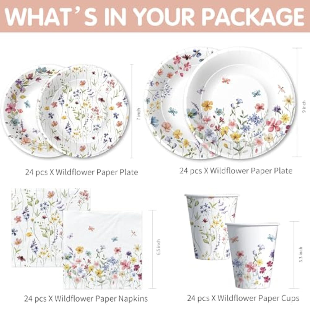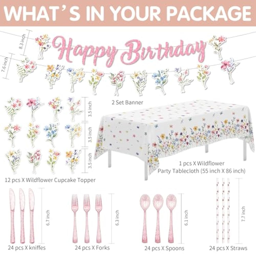 | ?Wildflower Birthday Decorations?This Wildflower Birthday Party Supplies Tableware Includes 24Pcs 9'' Wild Flower Dinner Plates, 24Pcs 7'' Floral Dessert Plates, 24Pcs Paper Napkins, 24Pcs Paper Cups, 24 Sets Of Disposable Cutlery, 24Pcs Paper Straws, 25Pcs Floral Print Balloons, 12Pcs Cupcake Topper , 1Pcs Wildflower Birthday Backdrop, 1Pcs Floral Party Tablecloth, 1Pcs Wildflower Garland Banner, Pink Glitter Happy Birthday Banner | | ?Floral Party Supplies?Celebrate In Style With This Beautifully Coordinated Tableware Featuring Soft Pink Flowers, Greenery, And Gold Accents. Adds A Touch Of Charm And Sophistication To Any Birthday Event | | ?Versatile Application? Floral Decorations Party Tableware Is Ideal For Girls’ Birthdays, Women’S Celebrations, Milestone Parties, Garden Parties, Or Even Afternoon Tea. Versatile Enough To Suit Indoor And Outdoor Events | | ?Disposable Convenience?Disposable Wildflower Floral Birthday Party Decorations For Girls Kit Makes Hosting Stress-Free—Just Set The Table And Toss Everything After The Party. Spend Less Time Cleaning And More Time Celebrating | | ?Premium Material?Crafted From Quality Material, These Party Supplies Are Strong Enough To Hold Cake, Snacks, And Drinks Without Leaks Or Tears, While Keeping Cleanup Simple | |