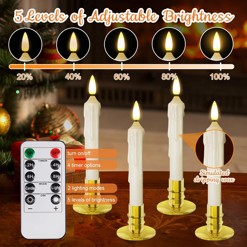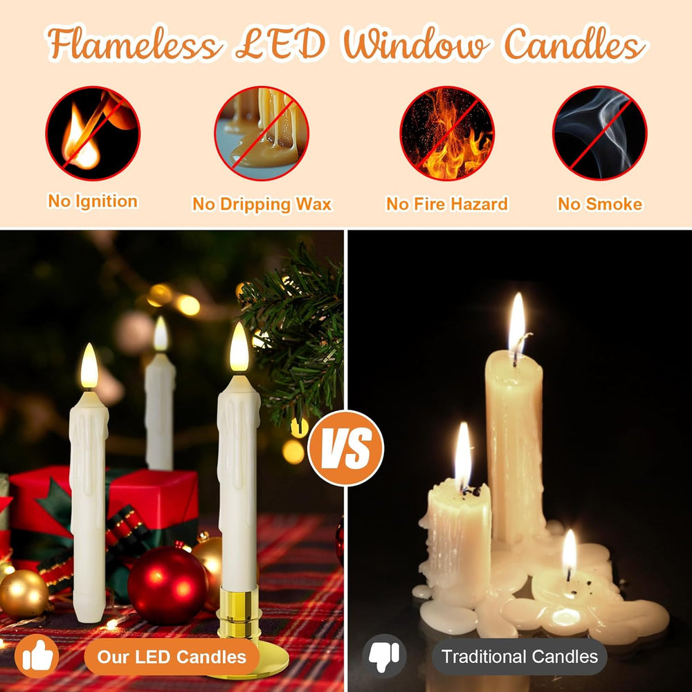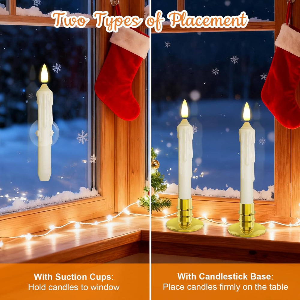 | Realistic 3D Flickering: Christmas Window Candles Feature A Lifelike 3D Flickering Wick And Simulated Dripping Wax Texture, Creating The Charm Of Traditional Taper Candles Without Fire, Smoke, Or Messy Wax | | Safe Battery Operated: Each Candle Is Powered By 2 Aa Batteries (Not Included). These Battery Operated Window Candles Are Flameless And Safe Around Children And Pets, Ensuring Worry-Free Festive Decorating | | Remote Control Timer: Includes 2 Remotes To Adjust Brightness, Flicker Modes, And Set 2H/4H/6H/8H Timers. Our Christmas Window Candles With Timer Repeat Every 24 Hours, Offering Effortless Holiday Ambiance | | Versatile Setup Holiday Decor: Comes With Candle Holders And Suction Cups To Display These Led Window Candles On Tables, Windowsills, Fireplaces, Or Attach Securely To Windows, Making Them Ideal For Flexible Decorating Indoors | | Complete Christmas Candle Set: Includes 12 Window Candles, 12 Candle Holders, 12 Suction Cups, 2 Remote Controls And 1 Manual. Perfect For Halloween, Christmas Parties, Weddings, Birthday Or Festive Displays | |
