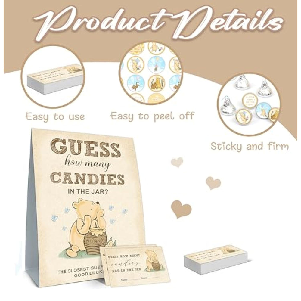 | What Will You Get: You Will Get 1 Double Sided How Many Candies Folding Sign, With 50 Guessing Cards, And 180 Pieces Baby Shower Stickers With 10 Different Patterns In 6 Sheets To Make Your Event Memorable. | | Perfect Size: The Guess How Many Candies Standing Sign Is 5X7-Inch Double-Sided Without Taking Up Spaces, The Guessing Card Is 2 X 3.5 Inch, And 0.75-Inch Diameter Baby Shower Stickers β Ensuring A Delightful And Stable Celebration Display. | | Interactive Fun For All Ages: This Game Is Perfect For Kids And Adults Alike. Guests Will Enjoy The Interactive Element Of Guessing The Number Of Sweet Kisses, Making It A Memorable And Entertaining Activity For Everyone At The Baby Shower. | | Easy To Set Up: The Set Is Hassle-Free To Set Up, Allowing You To Focus On Celebrating The Joyous Occasion. The Standing Sign Is Sturdy And Stands Out, Providing A Charming Display For The Game. | | Versatile Celebration Accessory: Our Baby Shower Party Game Card Kits Are Perfect For Various Occasions, Including Baby Shower, Birthday, And Candy Bars. Additionally, The Charming Baby Shower Candies Stickers Serve As Delightful Envelope Seals, Adorning Candy Gift Bags, Greeting Cards, Gift Boxes, And Other Party Favors With A Touch Of Elegance. Engage In The Entertaining "How Many Candies" Game By Guessing Candie In A Bottle Or Jar, Adding A Playful And Enjoyable Element To Your Event | |