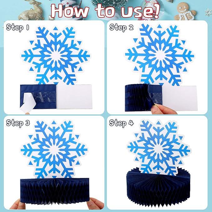This set includes twelve snowflake-themed honeycomb centerpieces in six different styles and two sizes, designed to add a sparkling touch to any party. The stylish snowflake designs are suitable for both boys and girls, creating an impressive and festive scene. Assembly is quick and simple, allowing you to place the decorations in your preferred display area to enhance your party atmosphere effortlessly. Perfect for Christmas parties, baby showers, birthdays, or as charming table décor, these centerpieces bring fun and joy to guests. Made from thick, sturdy cardstock, they are durable, resistant to deformation, and reliable for repeated use.