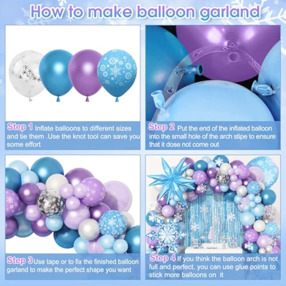 This 162-piece Winter Wonderland party kit includes a mix of snowflake confetti, pearlescent, metallic, and latex balloons in blue, purple, silver, and white tones, plus 2 fringe curtains, 12 snowflake decorations, and balloon tools. Made from premium, non-toxic latex, the balloons are durable and safe for kids and can be filled with air or helium. The kit also comes with a balloon strip, ribbon, tying tools, and glue dots for easy DIY assembly—just inflate, attach, and create a stunning snow-themed arch or backdrop in about 30 minutes. Perfect for creating a magical winter birthday celebration with family and friends.
