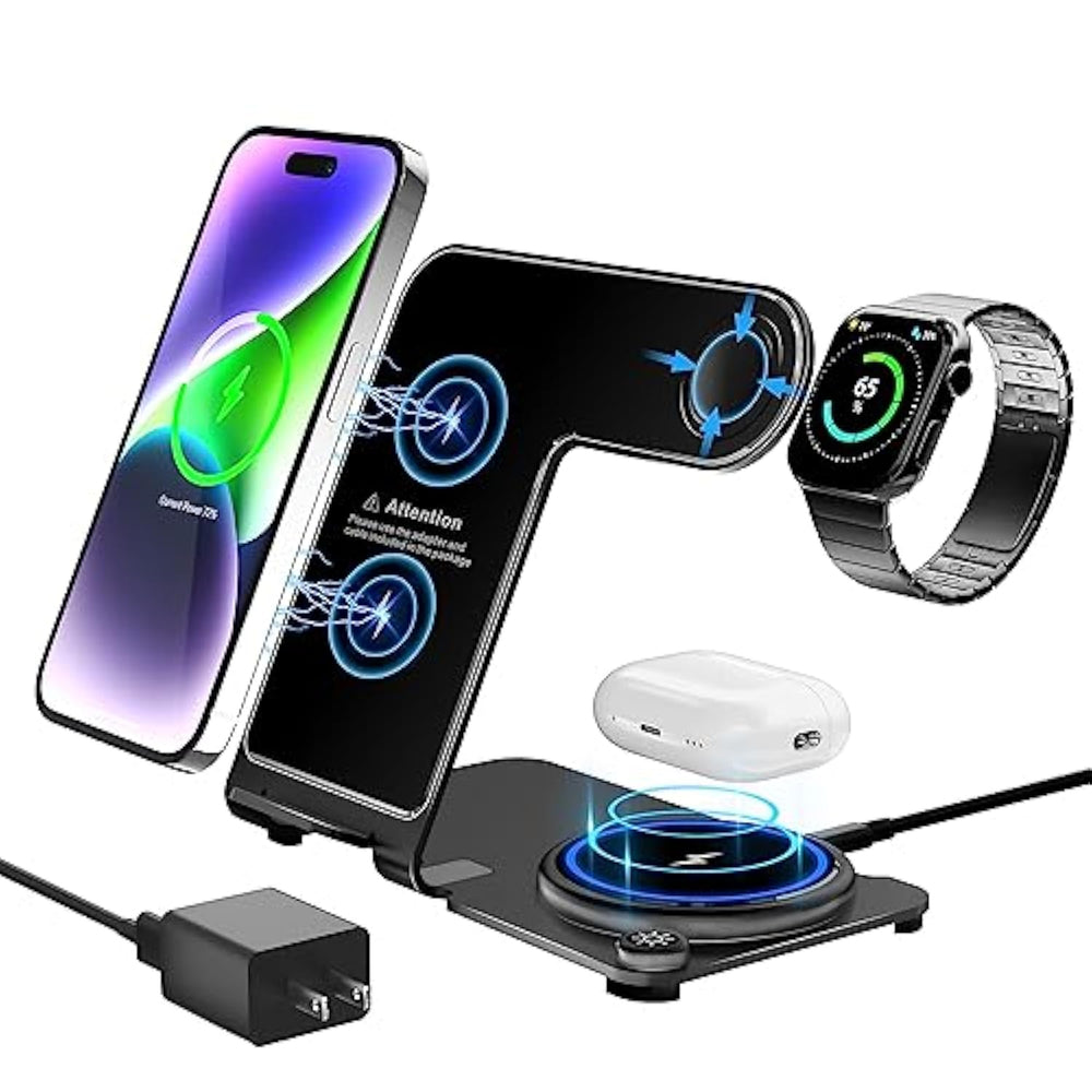 | ?Ultra-Thin Aluminum Alloy Charging Station??Aluminum Alloy Metal Is Stamped And Embedded 3 Wireless Charging Modules. Super Sturdy Device So It Can Stay With You For A Decade Or More. Charge Your Phone, Watch, And Headphones At The Same Time With Confidence! | | ?3 In 1 Wireless Charging Station?: Our Wireless Charging Dock Can Charge Most Phones, Apple Watch And Airpods Simultaneously, Just Place Them On The Charging Surface, Enjoy Fast Wireless Charging. Wide Compatibility For All Qi-Enabled Android And Ios Devices, Including Iphone14, 13 Mini/13/13 Pro/13 Pro Max/12 Mini/12/12 Pro/12 Pro Max/11/11 Pro/11 Pro Max/Xs/Xs Max/Xr/X/8/8P Or Qi Samsung Galaxy Series, Iwatch Se8/7/6/5/4/3/2, Airpods Pro/3/2. A Must Device For Apple Fans. | | ?High-Speed Wireless Charger?: After Many Extreme Tests And Feedback From Fans, We Use High-Power Charging Chips And World-Class Electronic Components To Ensure The Quality Of The Charger,And A 18W Special Adapter Is Provided With It,Which Can Charge Your Mobile Phone At High Speed And Safely. Iphone, Iwatch And Airpods Together Can Be Filled In Just 2 -3 Hours. | | ?Multi-Protection Charging Dock?: Fast Charging Wireless Charger Design. With Over-Current Protection, Over-Voltage Protection And Over-Temperature Protection As Well As Foreign Object Detection Function. Reasonable Internal Circuit Design Can Prevent Overcharge Damage To The Equipment Battery And Ensure Safe Charging Of The Device.(Note: Remove The Magnetic Or Metal Accessories From The Phone Case When Charging.) | | ?Smart Breathing Nightlight?: The Gentle Blue Indicator Light Not Only Clearly Shows The Charging Status, But Also Will Not Disturb You While Asleep, Absolutely A Perfect Nightstand Charging Station. Blue Breathing Light Indicates That Your Phone Is Properly Charging, While A Flash Blue Light Alerts You That There Is A Foreign Object Or Phone Is Misplaced. It Can Be Turned On/Off Manually If You Are Disturbed By The Light. | |