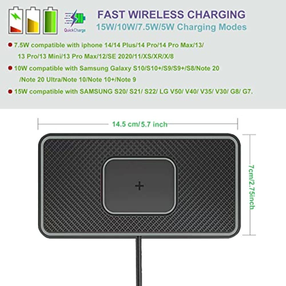 | ???15W Fast Wireless Charger Car Pad With 4 Charging Modes ?- C1 Wireless Car Charger Pad Have 4Charging Modes(5W/7.5W/10W/15W). | | 5W Charging Mode Works On Any Wireless-Charging-Enabled, 7.5W Charging Mode Is Compatible With Iphone 14/14 Plus/14 Pro/14 Pro Max/13/13 Pro/13 Mini/13 Pro Max/12/Se 2020/11/Xs/Xr/X/8 With Latest Ios System,10W Compatible With Samsung Galaxy S10/S10+/S9/S9+/S8/Note 20/Note 20 Ultra/Note 10/Note 10+/Note 9,15W Compatible With Samsung S20/ S21/ S22/ Lg V50/ V40/ V35/ V30/ G8/ G7. Note: Adapter Is Not Included, Qc3.0 Adapter Will Be Highly Recommended. | | ???Non-Slip Water Resistant Charging Pad?- C1 Wireless Charger Pad Come With A Rubberized Non-Slip Surface And Base, Will Keep Your Phone Stays Securely In Place While Charging. Water-Resistant,East To Clean , No Need To Worry About Spilling Water On Top. | | ???New Design Charger Pad To Avoid Over Heat?- C1 Wireless Car Charger Has Been Design To Separate The Charging Coil From The Circuit Board Which Might Get Some Heating When The Pad Coil Is Supply Wireless Charging. As The Wireless Charging Coil Is Inside Charging Pad And The Circuit Board Is Outside The Pad, They Are Far From Each Other. When You Are Charging On The Pad (Over The Charging Coil), The Circuit Board Will Not Get Heat, So Do The Whole Charger Pad And Your Phone. | | ???Case Friendly Large Compatibility Wireless Phone Charger?- C1 Wireless Car Charger Pad Is Able To Charge Through Cases Up To 4Mm In Thickness. 15W/10W/7.5W Fast Charging Mode, The Charging Pad Will Automati