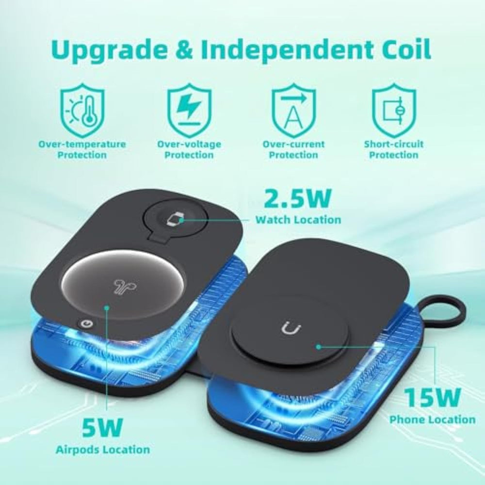 | ?Fast Charging, 3 In 1 Charger With 18W Qc3.0 Adapter?If You'Re An Apple Enthusiast With An Apple Watch, Airpods, And Iphone, This Magnetic Wireless Charger Is A Game-Changer. Perfect For Home, Office, Or Travel, This 3-In-1 Foldable Charging Station Simplifies Your Life By Charging All Your Essential Devices In One Go. No More Juggling Multiple Chargers Or Hunting For Available Outlets | | ?15W Magnetic Wireless Charger For Iphones? ? Wireless Charging Pad For Iphone 16/16Pro/16Pro Max/16Plus/15/15 Plus/15 Pro/15 Pro Max/14/14 Pro/14 Pro Max/13/13 Pro/13 Pro Max/ 12/12 Pro/12 Pro Max/Se 2/Se 3/X/Xr/Xs/Xs Max/8/8 Plus; ?Charging Pad Also Charge For Samsung Phones Galaxy S24/S23 Ultra S22 S21 S20 Ultra/Plus/Fe, S10/S10E/S10+/S9/S9+/S8/S8+, Galaxy Z Flip 5/4/3/2/1, Z Fold 5/4/3/2/1, Galaxy Note20/10/10+/9/8/7/5; ?Other Phones With Wireless Charging Function | | ?2.5W Magnetic Wireless Charging Station For Iwatch?For Watch Charger Part, It Is Only Compatible With Apple Watch 9 8 7 6 5 4 3 2 Ultra 2 1. [Cannot Charge For Galaxy Watch] | | ?5W Wireless Charging Pad For Airpods? ?Charger For Airpods Pro/Pro2/3/2 (Wireless Version); ?Also Charging Compatible With Galaxy Buds/Pro/Live; ?Other Earphones With Wireless Charging Function | | ?Portable And Foldable?Due To The Compact And Foldable Design Of The Charger Pad, It Is More Suitable For Travel, Home, Office, And Other Scenarios, Which Is Really A Great Space Saver. Also, When Not Using You Can Fold It Up, And Takes Up Even Less Space, Very Easy To Carry With Suitcases, Backpacks, Handbags, Etc., So It'S On The Travel Must-Haves List. (When Folding The Size Is 5.25In*3.57In*0.76In, 0.35Lb) | | ?Value-Added Services ? Complimentary 18W Adapter, 3.9Ft Type-C Charging Cable, User Manual, 24H Friendly